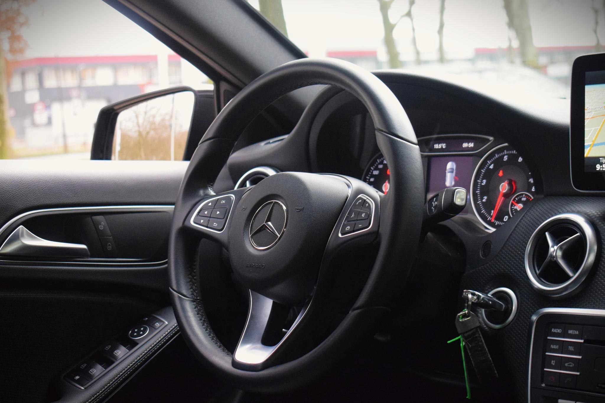 Tijdens de rit bedient u het audio-installatiesysteem en het full map navigatiesysteem met de knoppen op het stuur. De achteropkomend verkeer waarschuwing bewaakt de afstand tot achterliggers en geeft een signaal als er te weinig ruimte is. Met de aanwezige parkeersensoren weet u altijd zeker of het past. De elektronische systemen in deze Mercedes-Benz helpen u actief om comfortabeler te rijden. Een automatisch inschakelbare verlichting en een regensensor houden de omstandigheden onderweg in de gaten. Cruise control is aanwezig; prettig voor de lange einden. Natuurlijk behoren airconditioning, lederen stuur en centrale deurvergrendeling met afstandsbediening ook tot de uitrusting van deze complete auto.