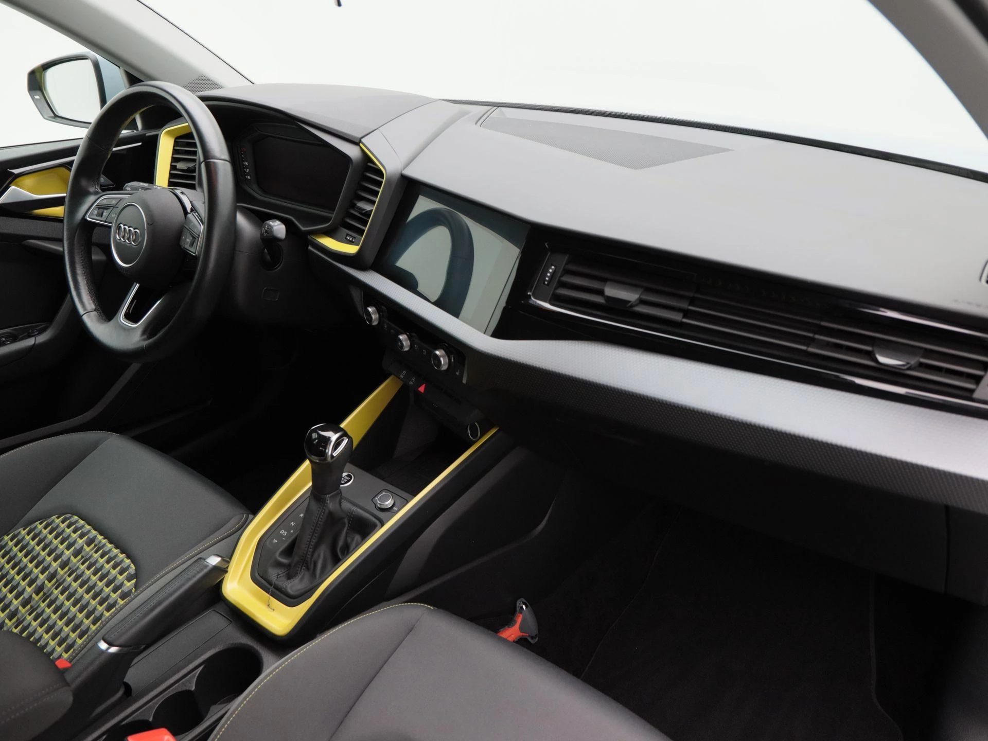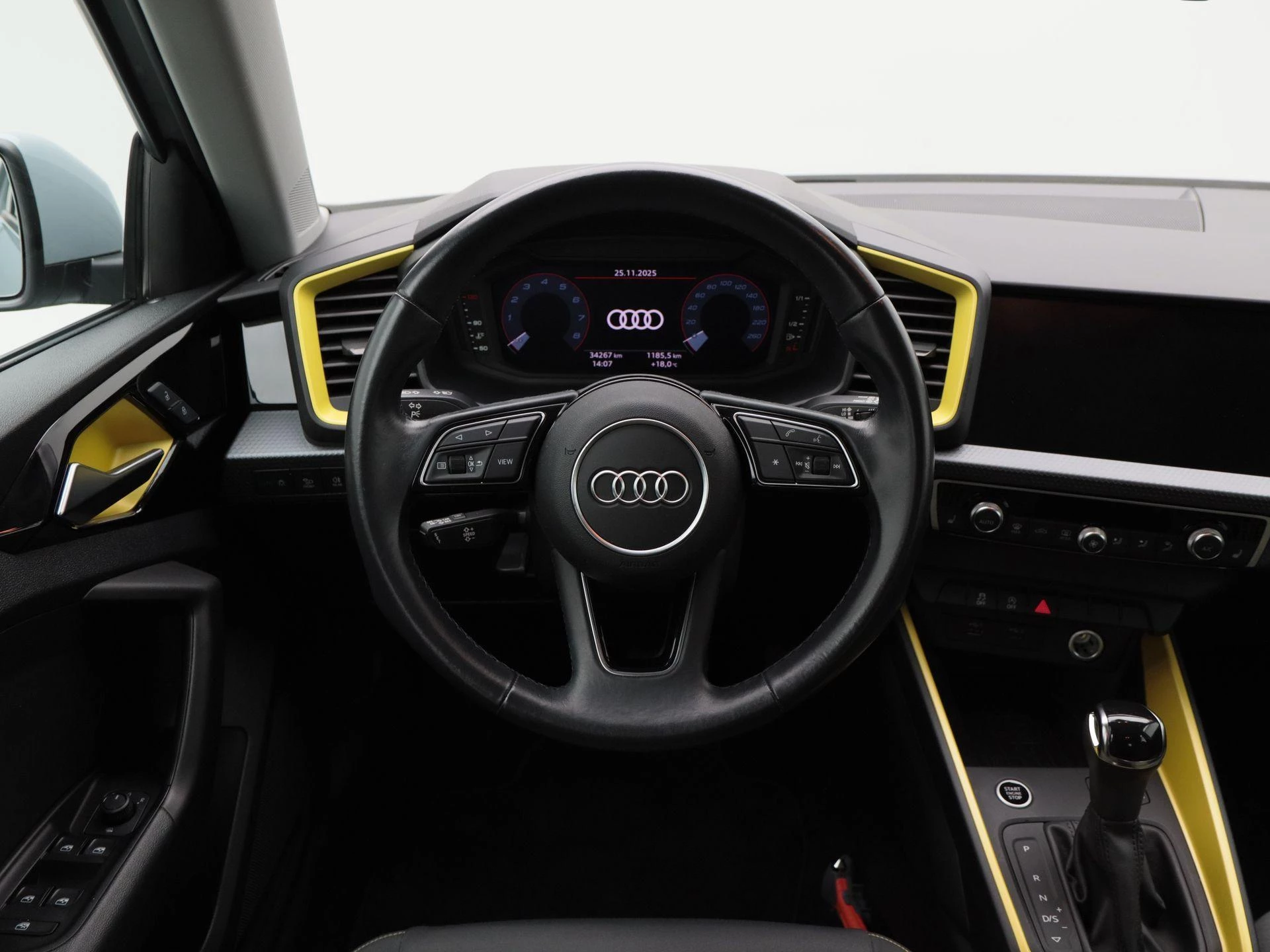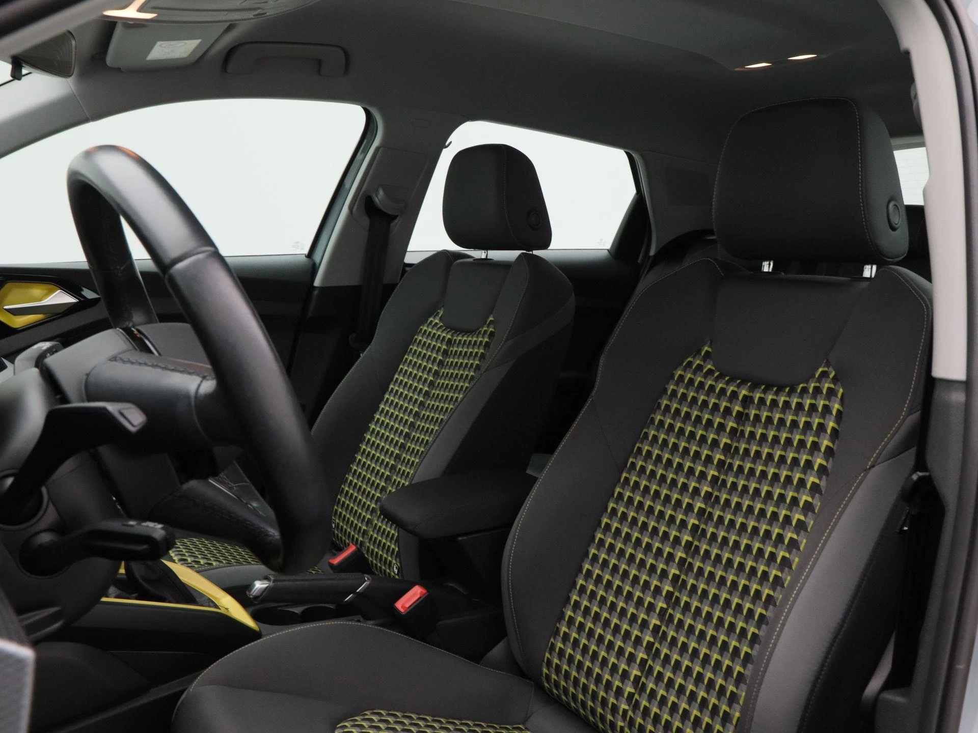 Het interieur valt direct op door zijn unieke antraciet met gele kleuraccenten, wat zorgt voor een sportieve en frisse uitstraling. Daarnaast is deze uitvoering voorzien van een lederen stuurwiel, stoelverwarming, elektronische climate control (ECC) en een strak vormgegeven digitaal dashboard.