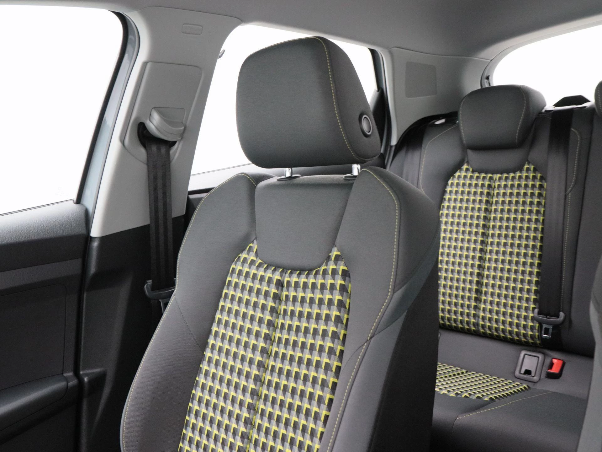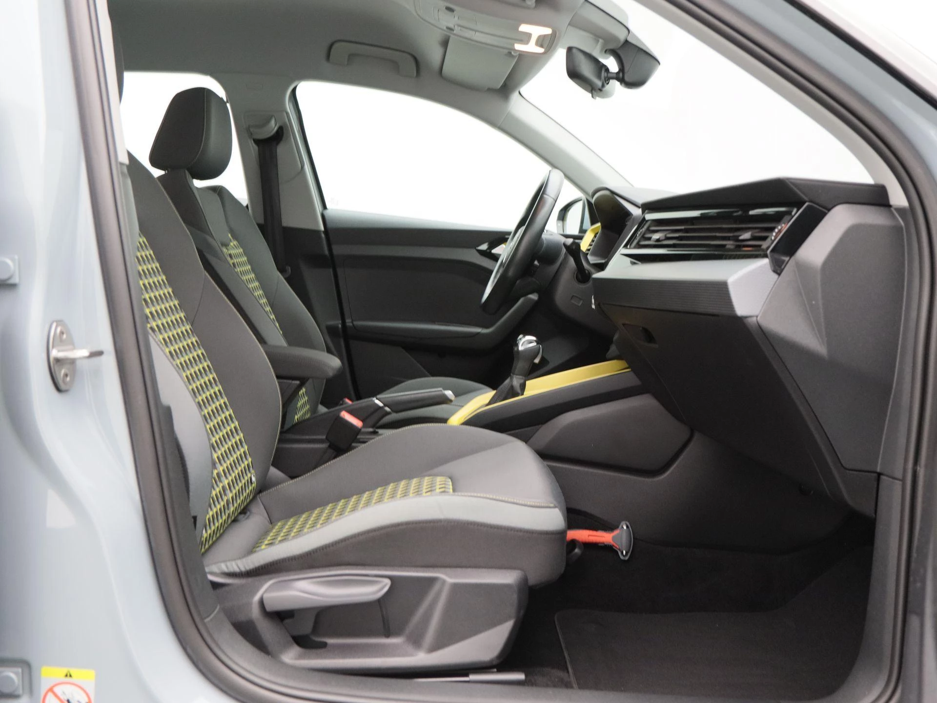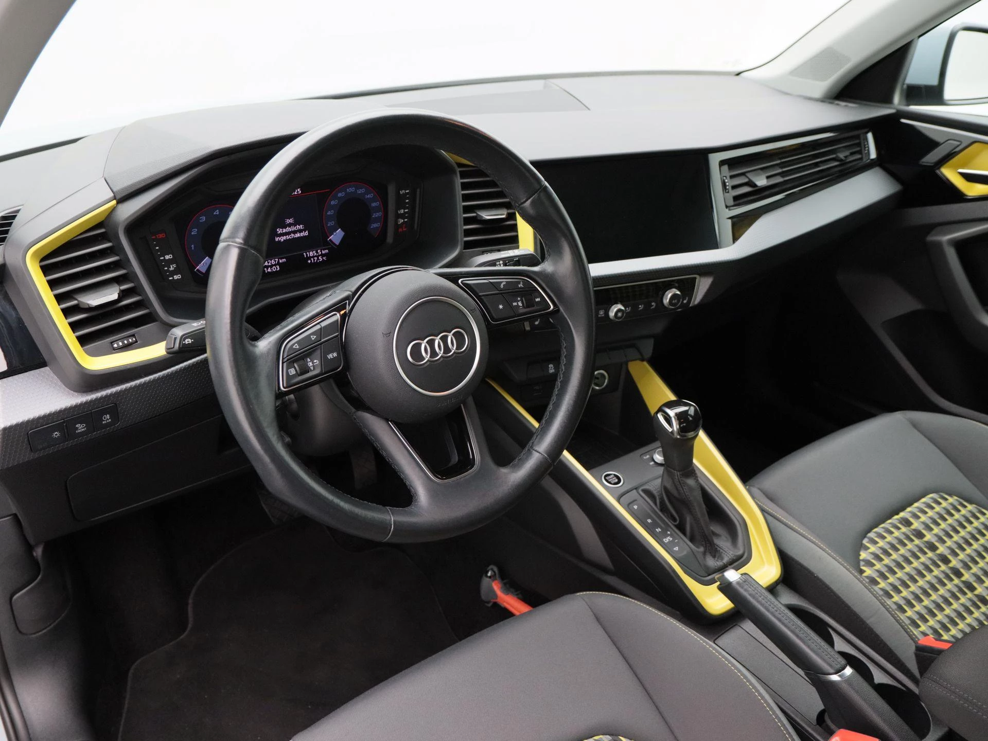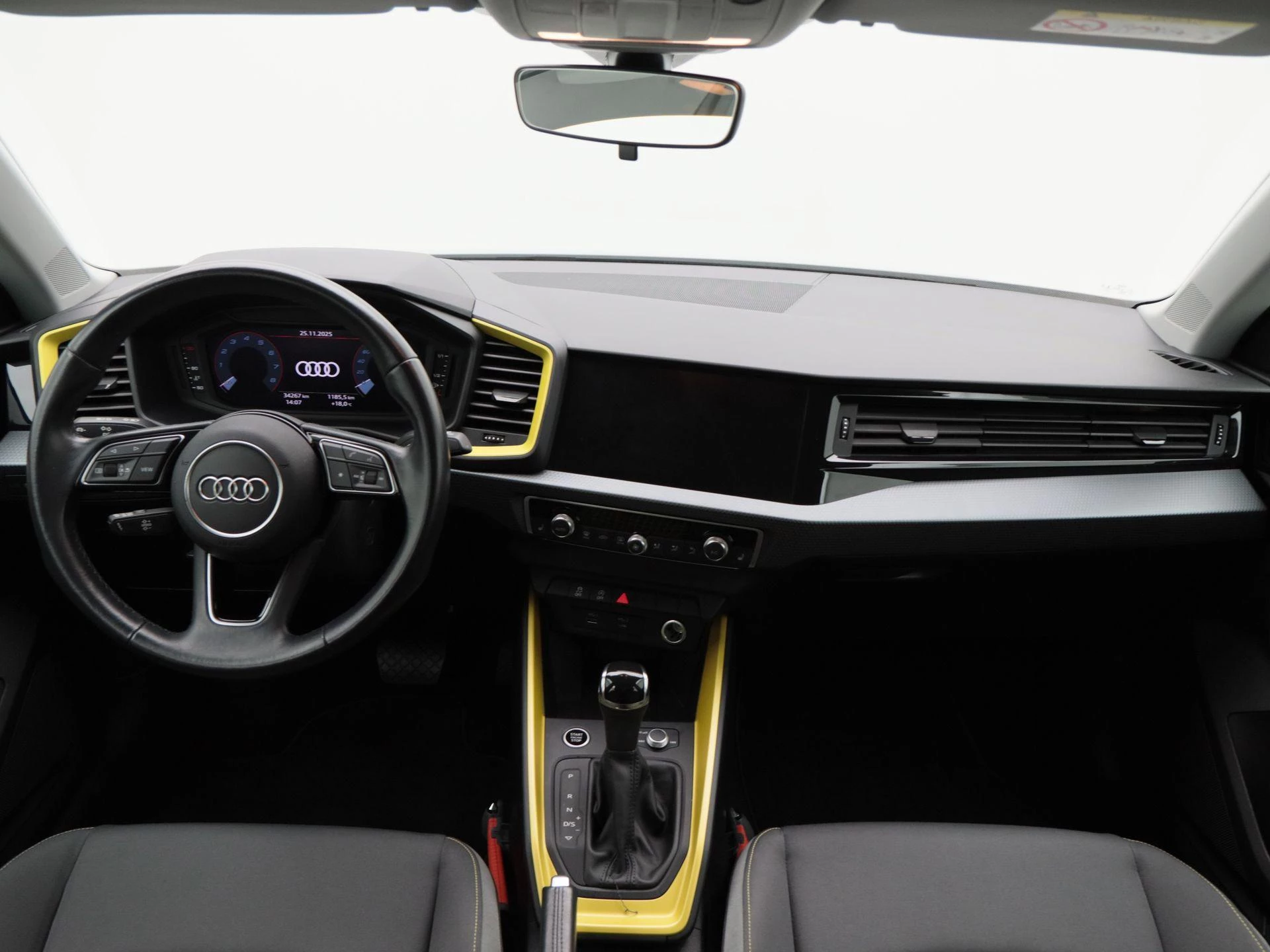 Het interieur valt direct op door zijn unieke antraciet met gele kleuraccenten, wat zorgt voor een sportieve en frisse uitstraling. Daarnaast is deze uitvoering voorzien van een lederen stuurwiel, stoelverwarming, elektronische climate control (ECC) en een strak vormgegeven digitaal dashboard.