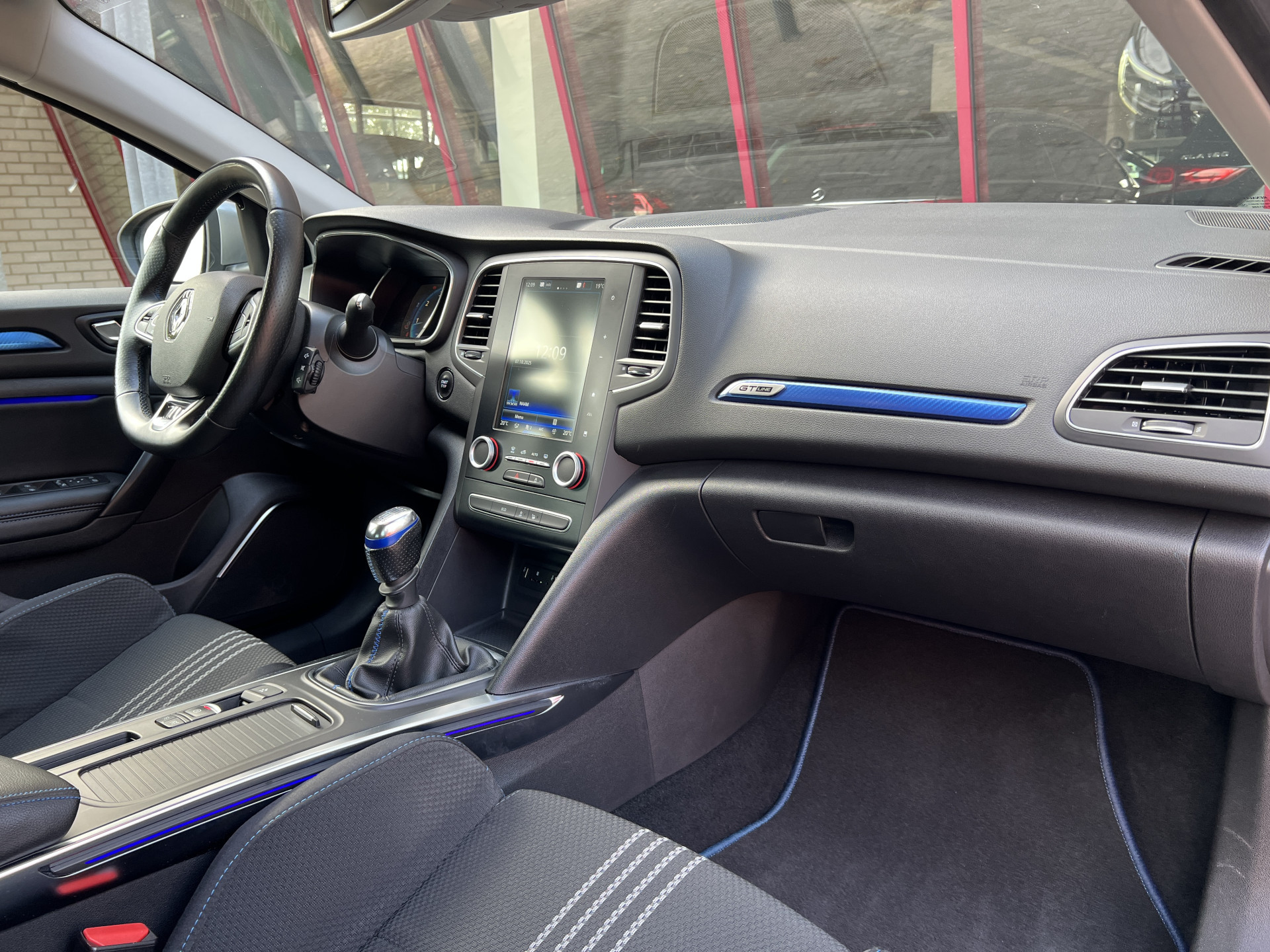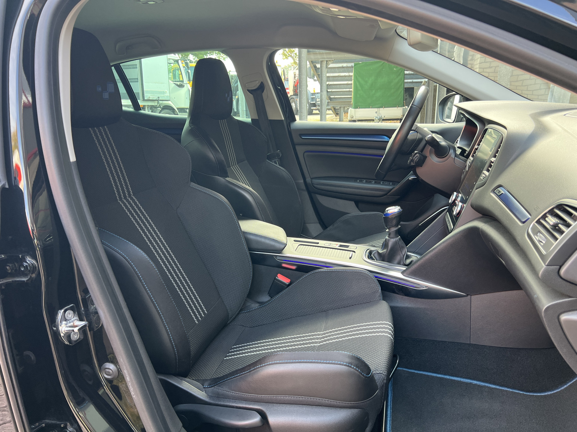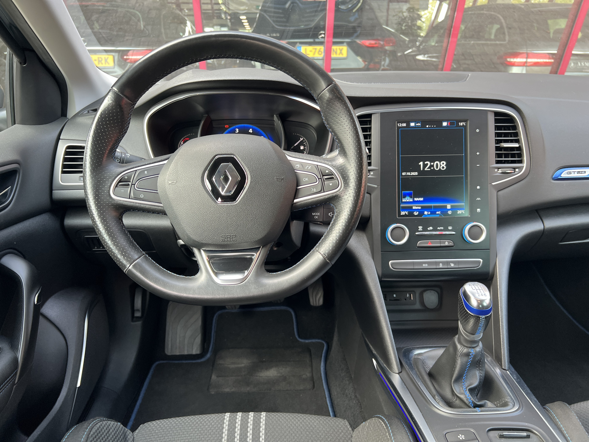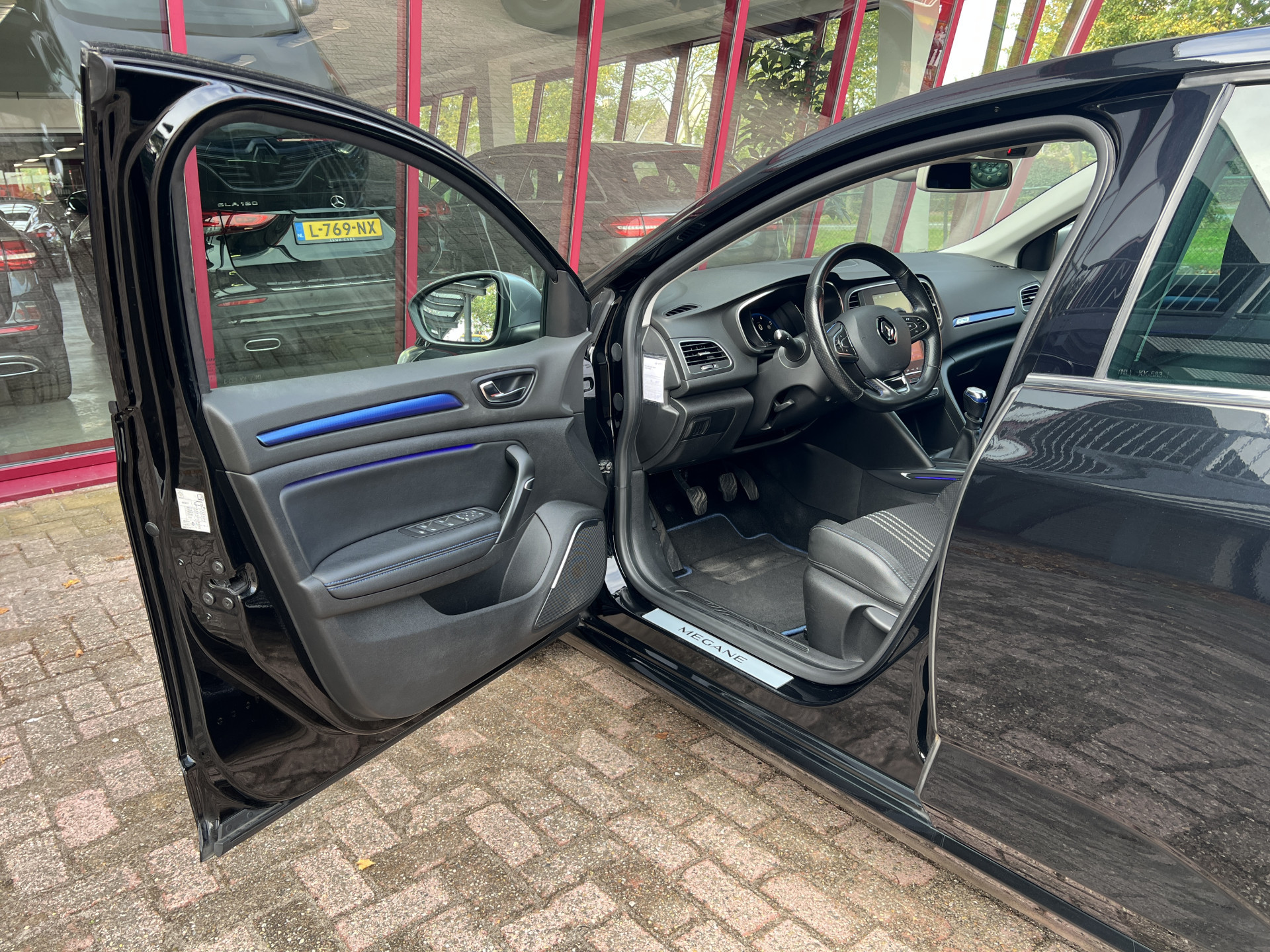 Super leuke Renault Megane GT-line! Sportieve, handgeschakelde 5 deurs hatchback uitgevoerd in een mooie combinatie van diepzwarte lak met een sportief interieur met blauwe accenten.