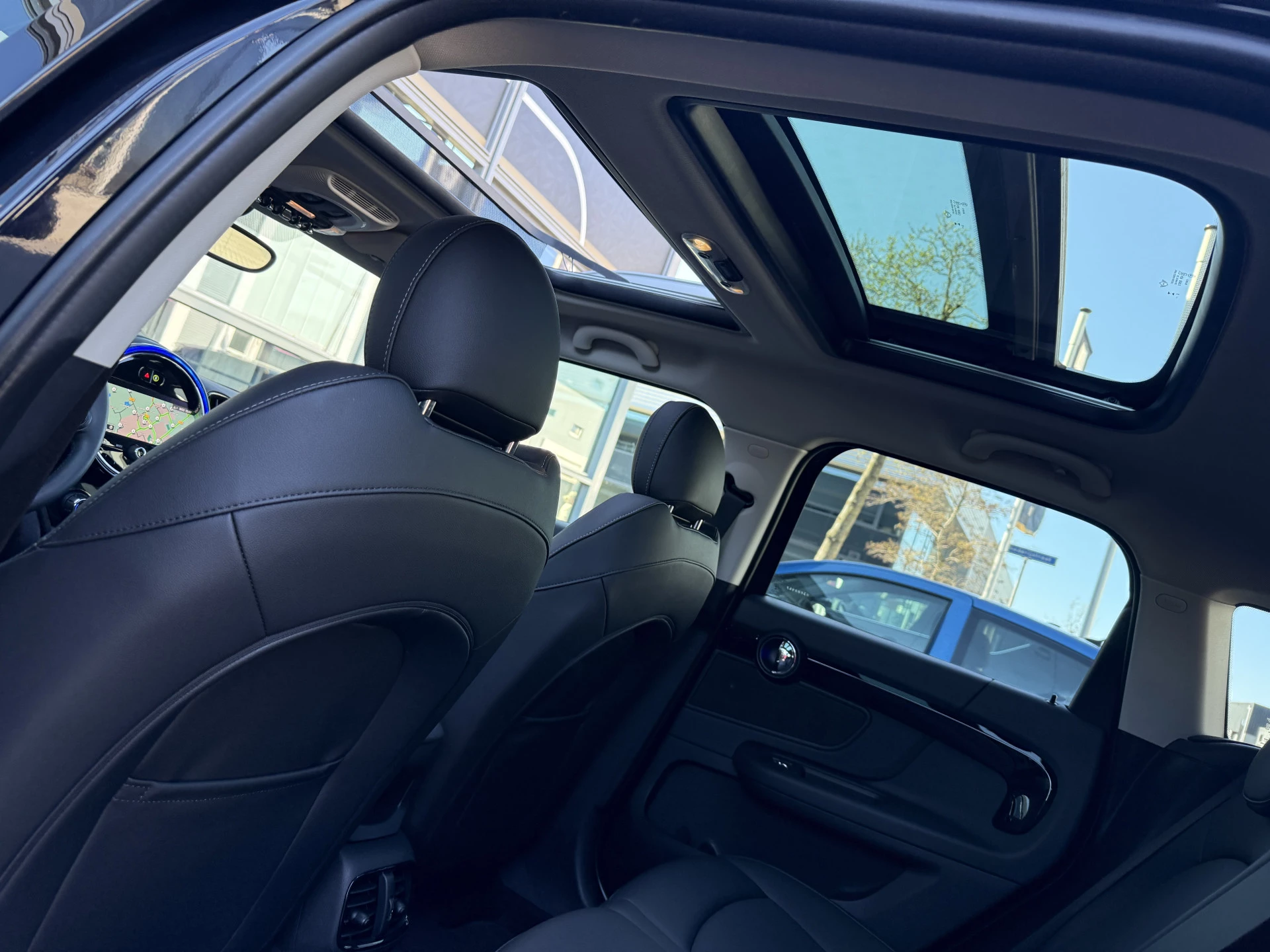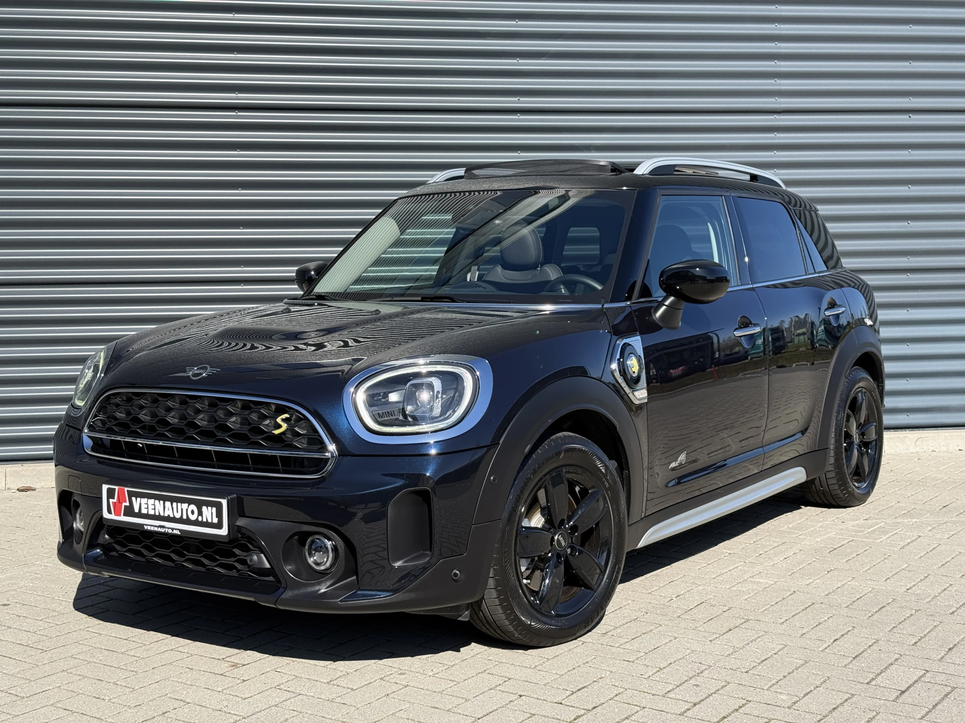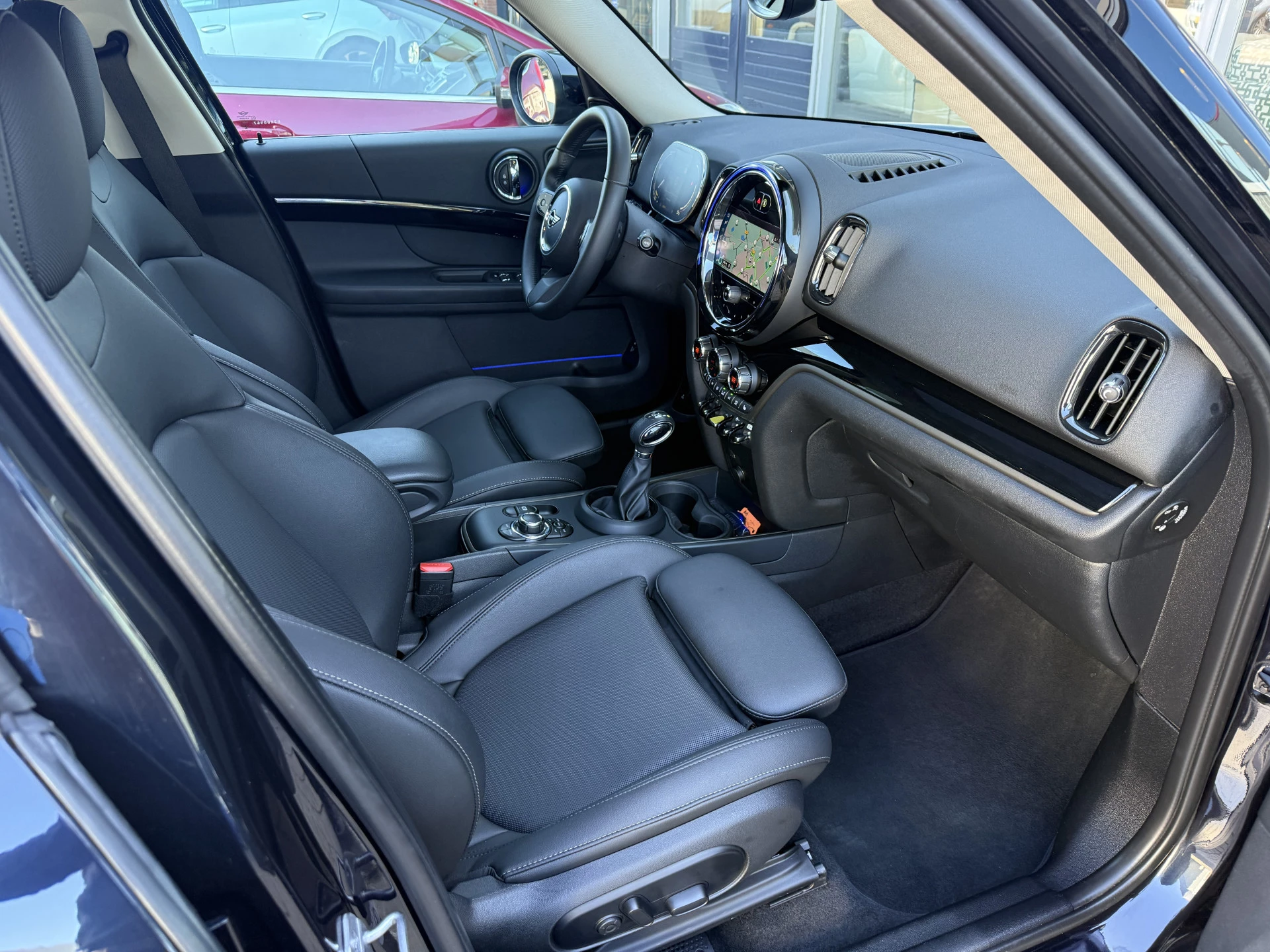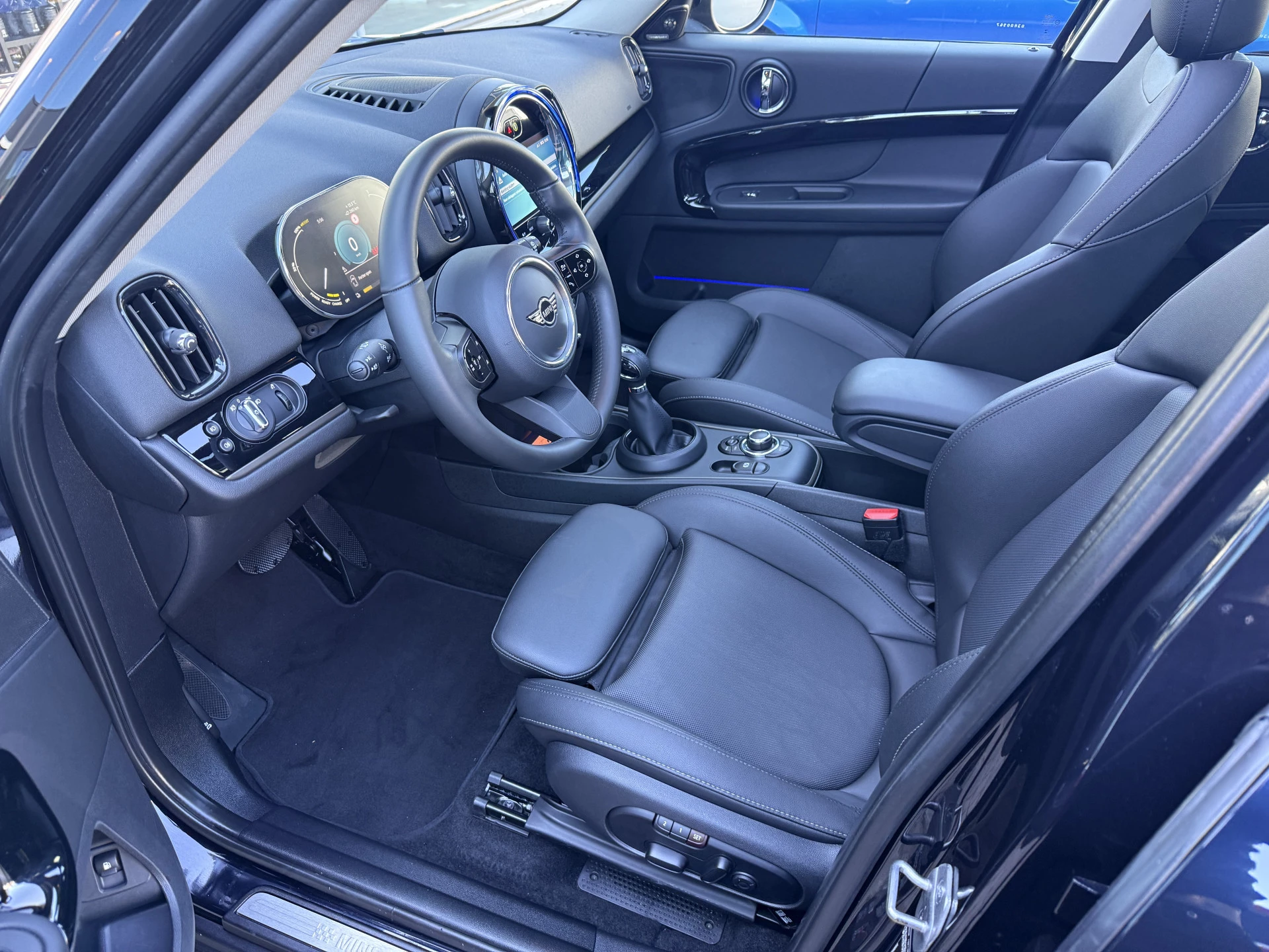 Schitterende Mini Countryman Cooper SE ALL4 Plug in Hybrid in Enigmatic Black (diep donker blauw) metallic met hoogglans zwarte licht metalen velgen. Deze Mini is van 12-2022 en bijzonder compleet uitgerust met onder andere de volgende opties: Panorama dak, elektrische bedienbare voorstoelen met memory, lederen bekleding, Harman Kardon Audio, LED interieur sfeer verlichtingspakket, Apple Carplay, achteruitrijcamera, navigatie, virtuele cockpit, adaptieve cruise control, keyless entry, parkeersensoren voor + achter met parkeer assistent, etc..