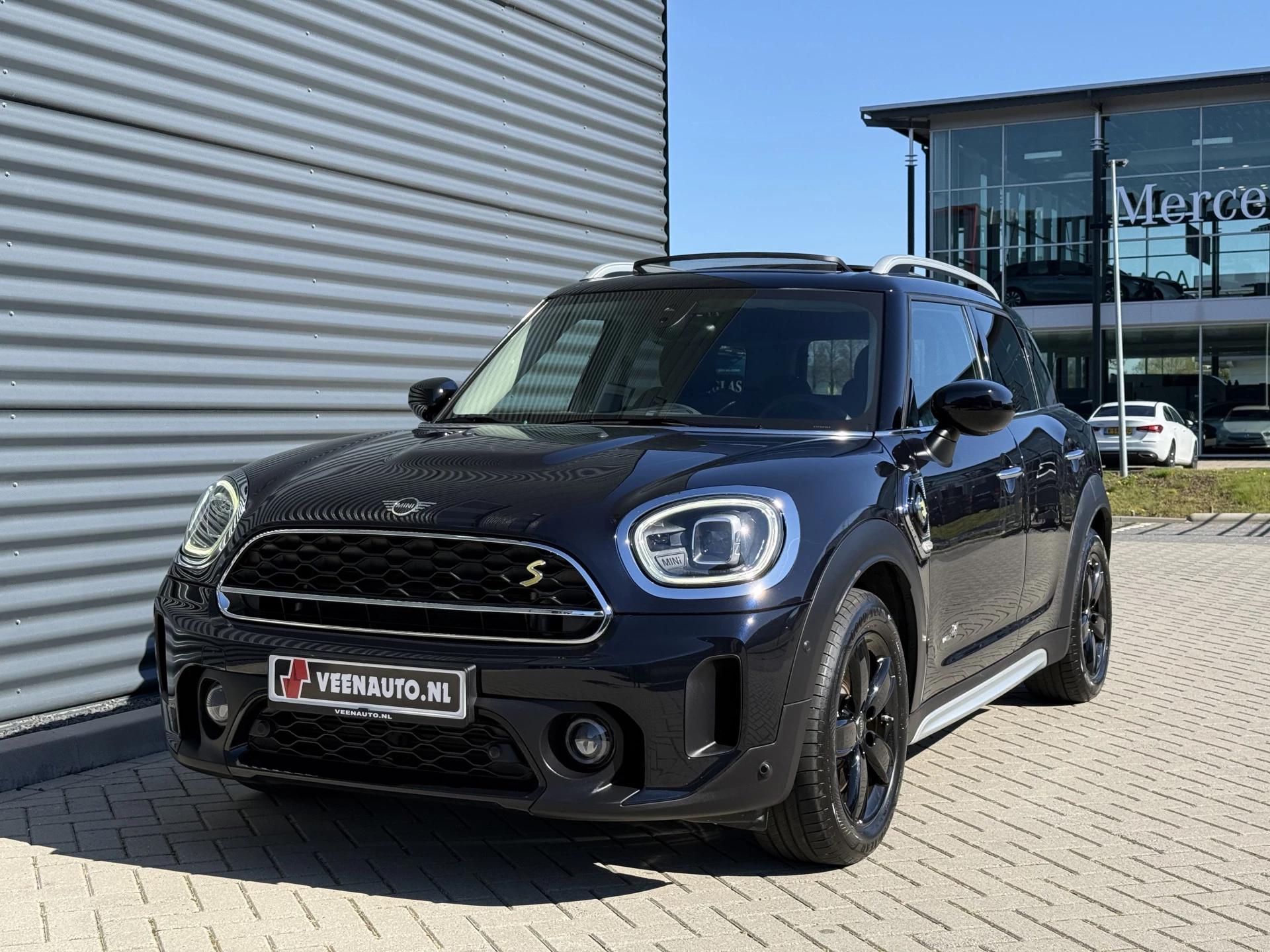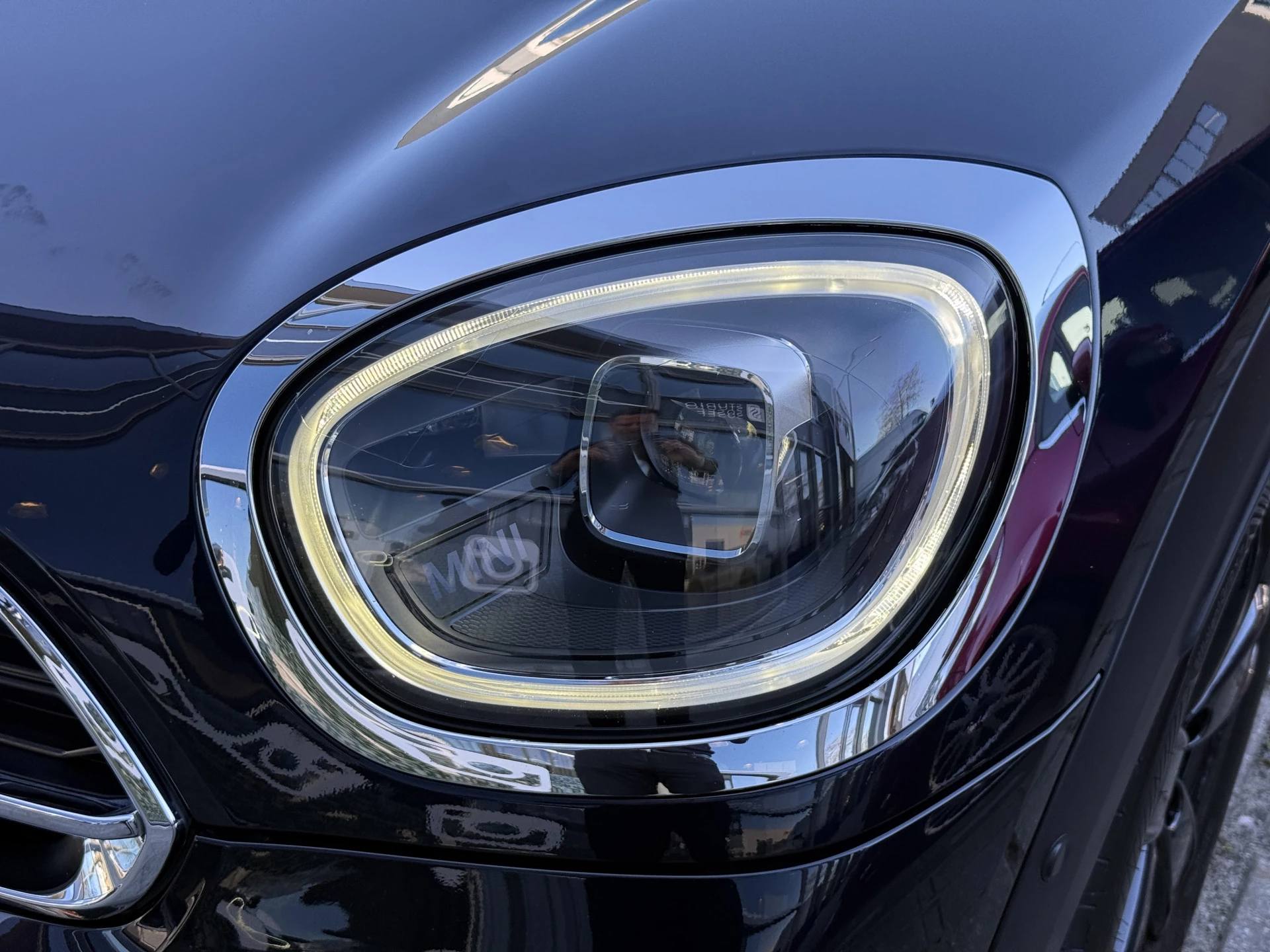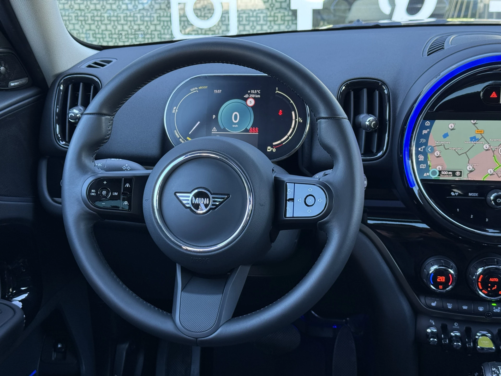 Schitterende Mini Countryman Cooper SE ALL4 Plug in Hybrid in Enigmatic Black (diep donker blauw) metallic met hoogglans zwarte licht metalen velgen. Deze Mini is van 12-2022 en bijzonder compleet uitgerust met onder andere de volgende opties: Panorama dak, elektrische bedienbare voorstoelen met memory, lederen bekleding, Harman Kardon Audio, LED interieur sfeer verlichtingspakket, Apple Carplay, achteruitrijcamera, navigatie, virtuele cockpit, adaptieve cruise control, keyless entry, parkeersensoren voor + achter met parkeer assistent, etc..