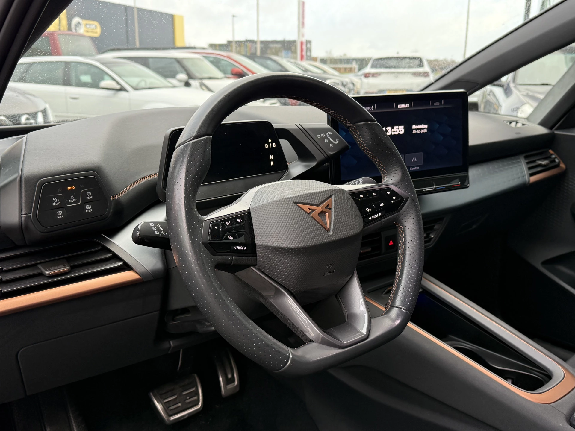 Uw rit wordt comfortabel en veilig gemaakt door het digitale dashboard dat alles projecteert wat u wenst in de digitale wereld van mobiliteit. De achteruitrijcamera maakt inparkeren gemakkelijker dan ooit. Adaptive cruise control houdt de ingestelde snelheid vast en houdt afstand tot het voertuig voor u. Deze CUPRA Born is voorzien van remote services. Via uw smartphone bedient u diverse functies ook op afstand en krijgt u informatie over de status van uw auto. Gemakkelijk en veilig is de spraakbediening voor het audio-installatiesysteem en het navigatiesysteem. Daarbij kunt u deze ook bedienen met de knoppen op het stuur. De audio-kwaliteit is geweldig, dankzij de DAB-ontvangst. De uitrusting van deze CUPRA is met automatische airconditioning, draadloos opladen, regensensor, keyless entry, automatisch dimmende binnenspiegel en isofix-aansluiting behoorlijk compleet.