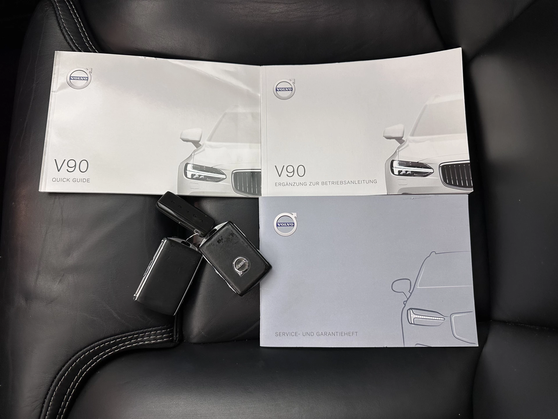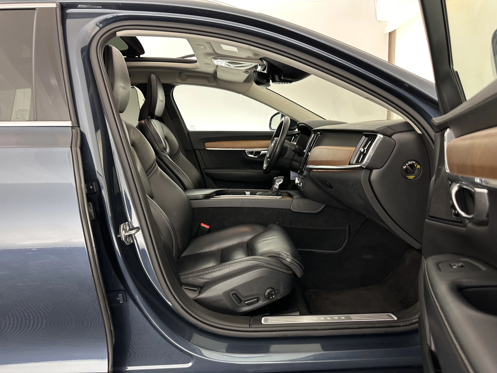 ⭐ Volvo V90 2.0 D4 Momentum Pro in Denim Blue Metallic met Moritz leder in Charcoal (zwart) en witte stiksels | Elegant, Ruim & Comfortabel