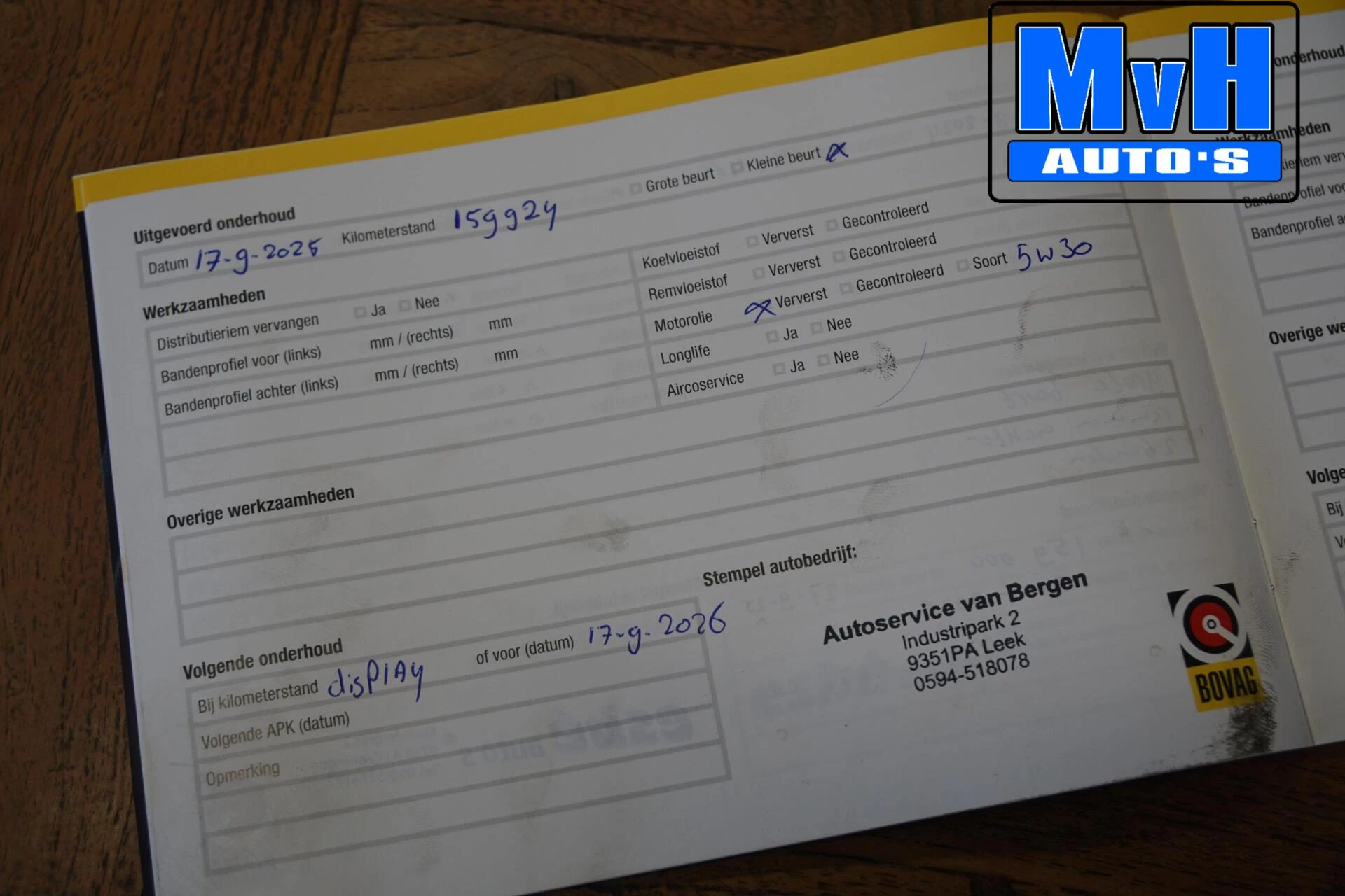Laatste onderhoudsbeurt gehad in september 2025 bij 159.924km.