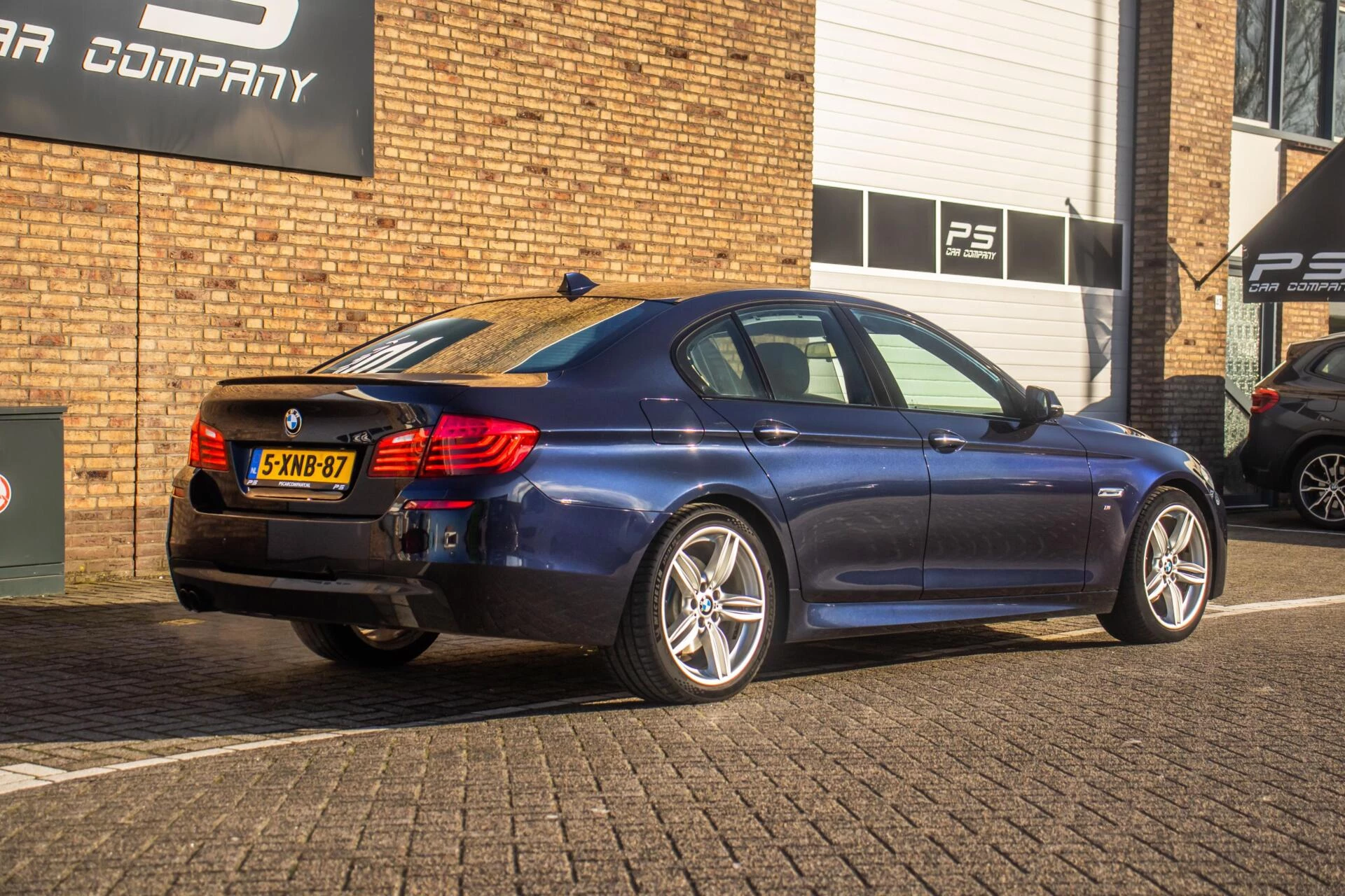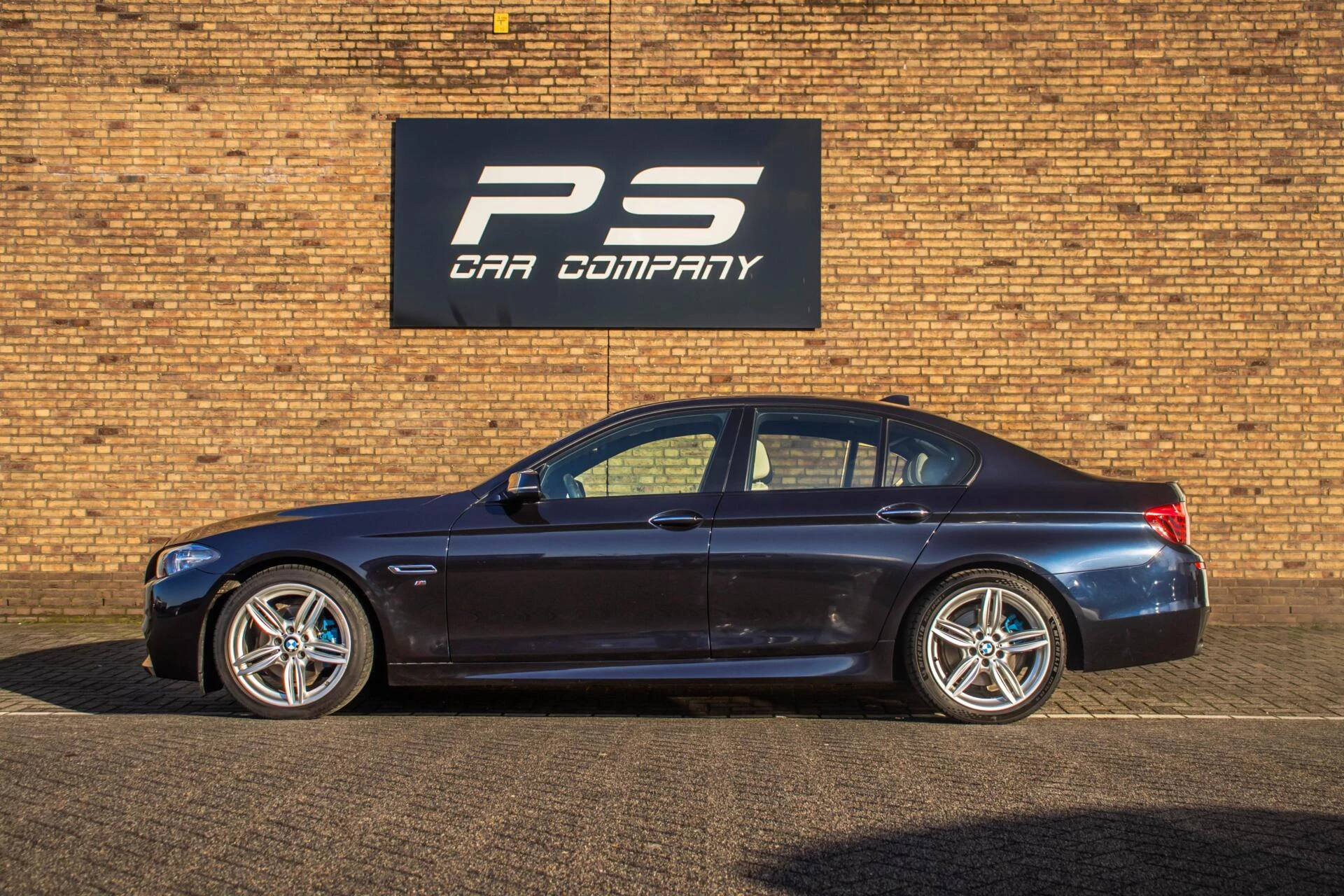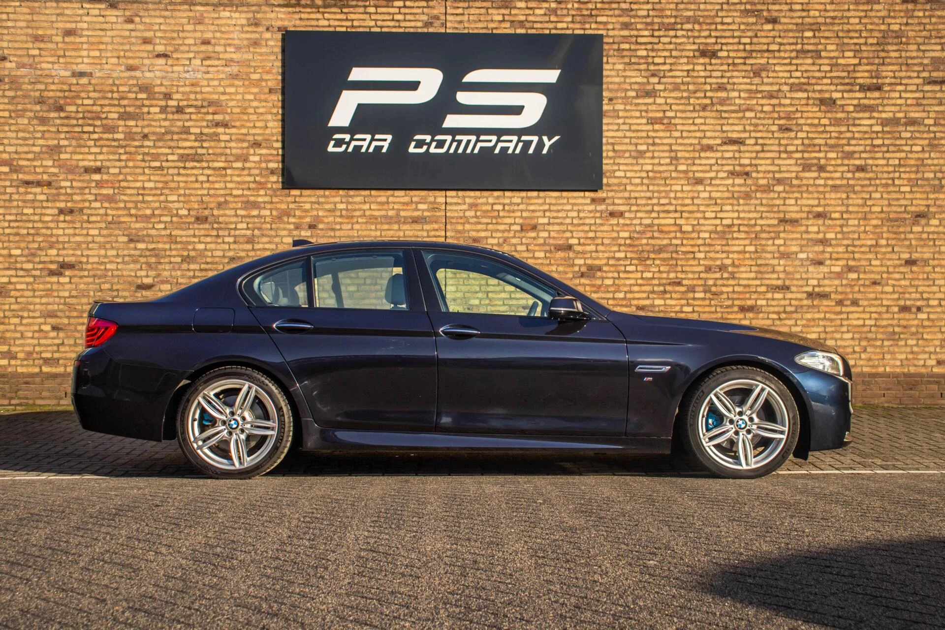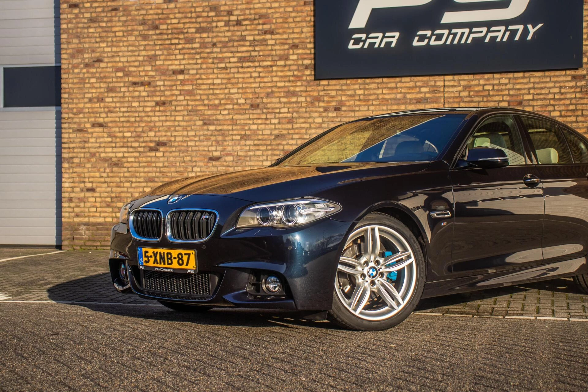 De carrosserie is uitgevoerd in Carbon Black metallic, een diepe en luxe kleur die perfect past bij het dynamische lijnenspel van de 5-serie. De 19 inch lichtmetalen velgen en de blauwe remklauwen geven de auto een uitgesproken sportieve uitstraling zonder dat het geheel zijn chique karakter verliest. De strakke lijnen en lage houding maken deze BMW tot een opvallende verschijning op de weg.