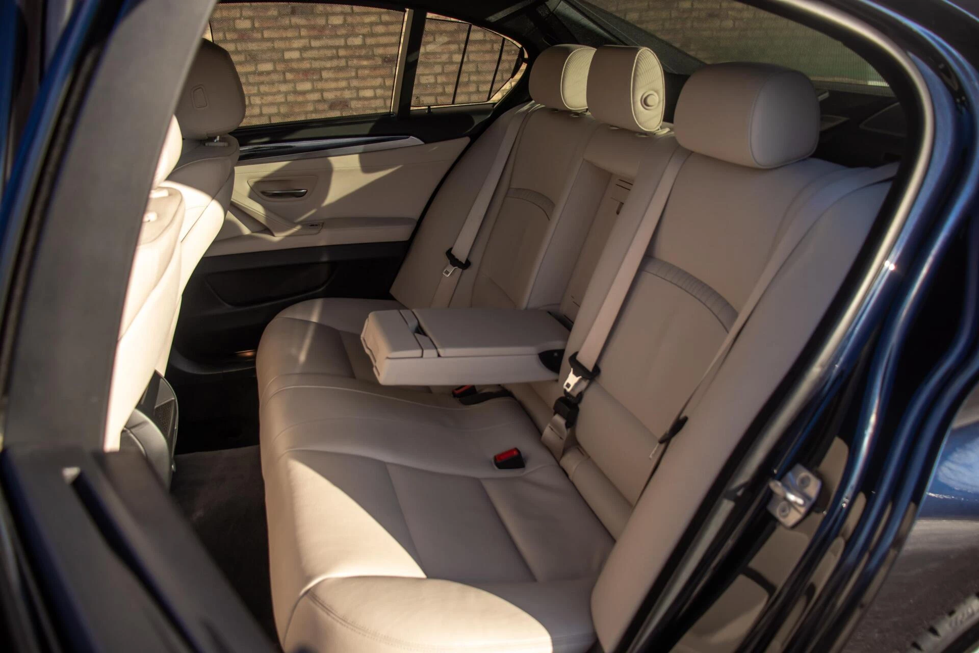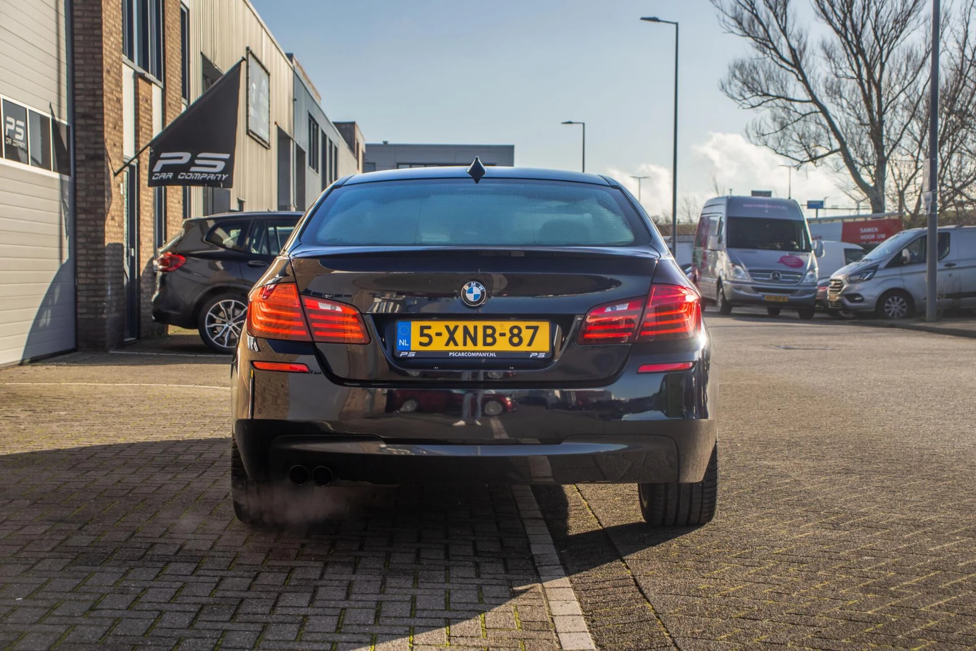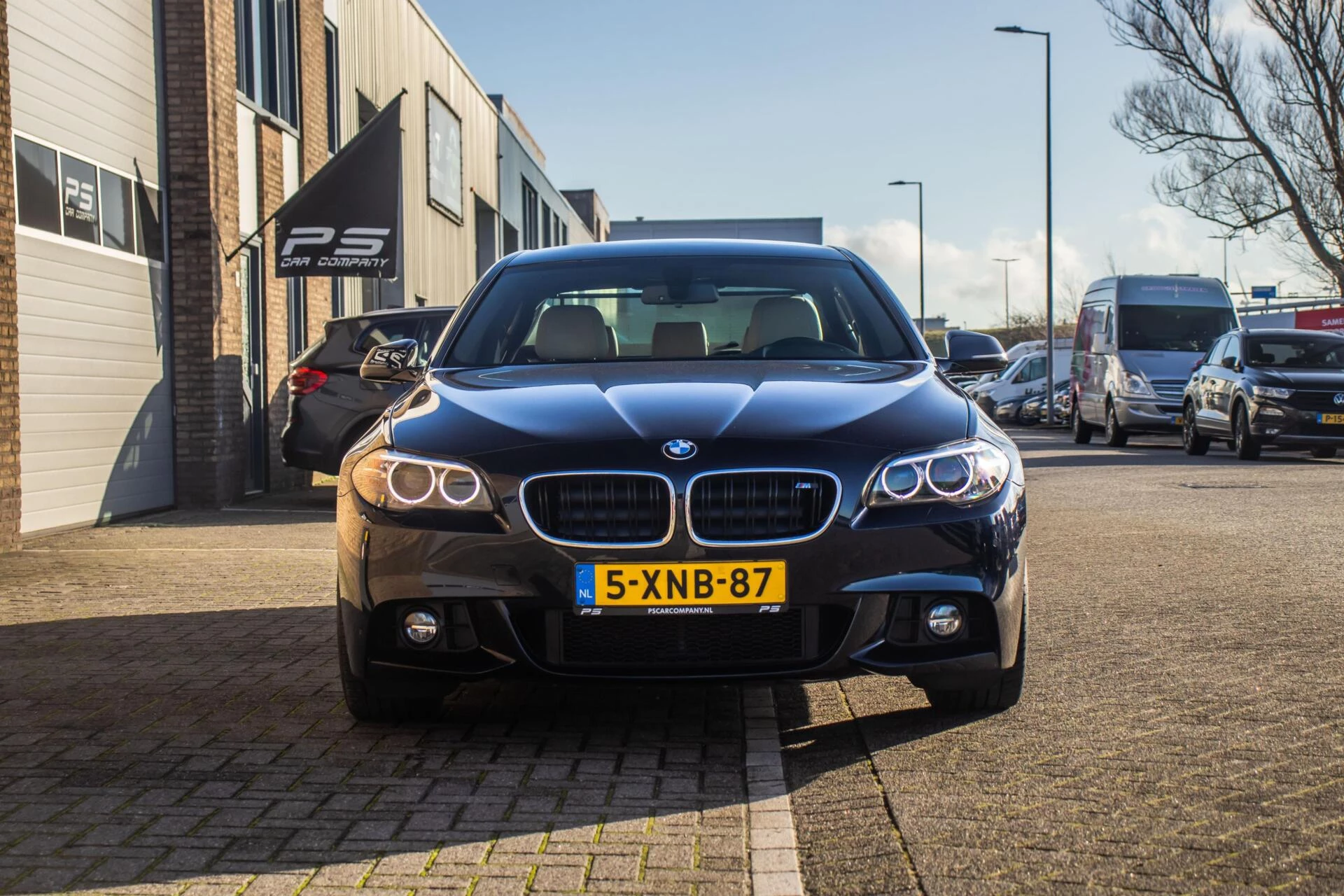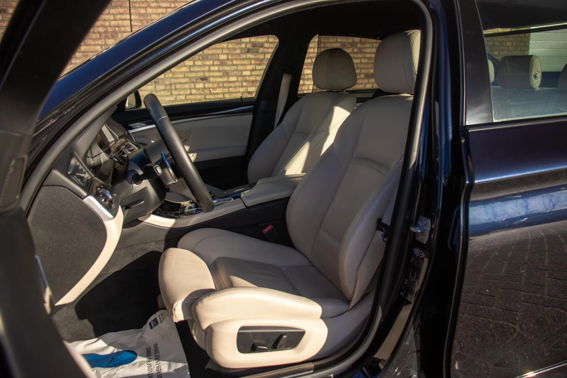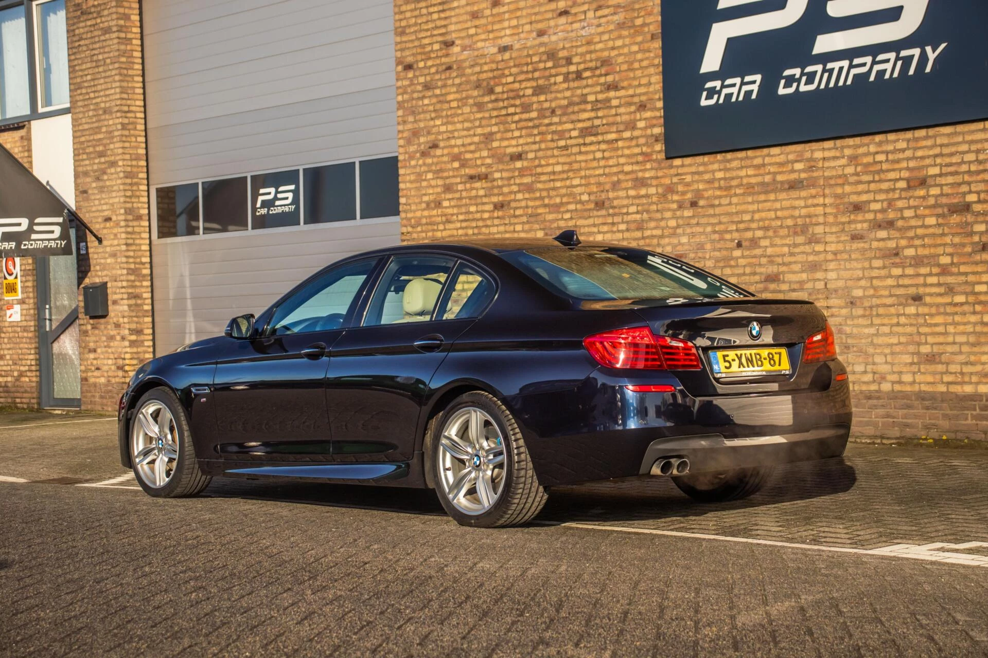 De carrosserie is uitgevoerd in Carbon Black metallic, een diepe en luxe kleur die perfect past bij het dynamische lijnenspel van de 5-serie. De 19 inch lichtmetalen velgen en de blauwe remklauwen geven de auto een uitgesproken sportieve uitstraling zonder dat het geheel zijn chique karakter verliest. De strakke lijnen en lage houding maken deze BMW tot een opvallende verschijning op de weg.