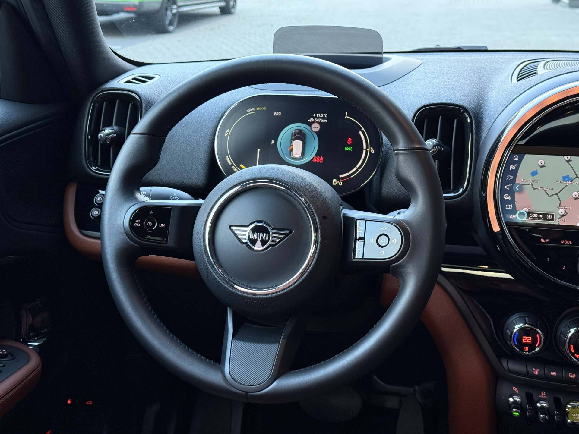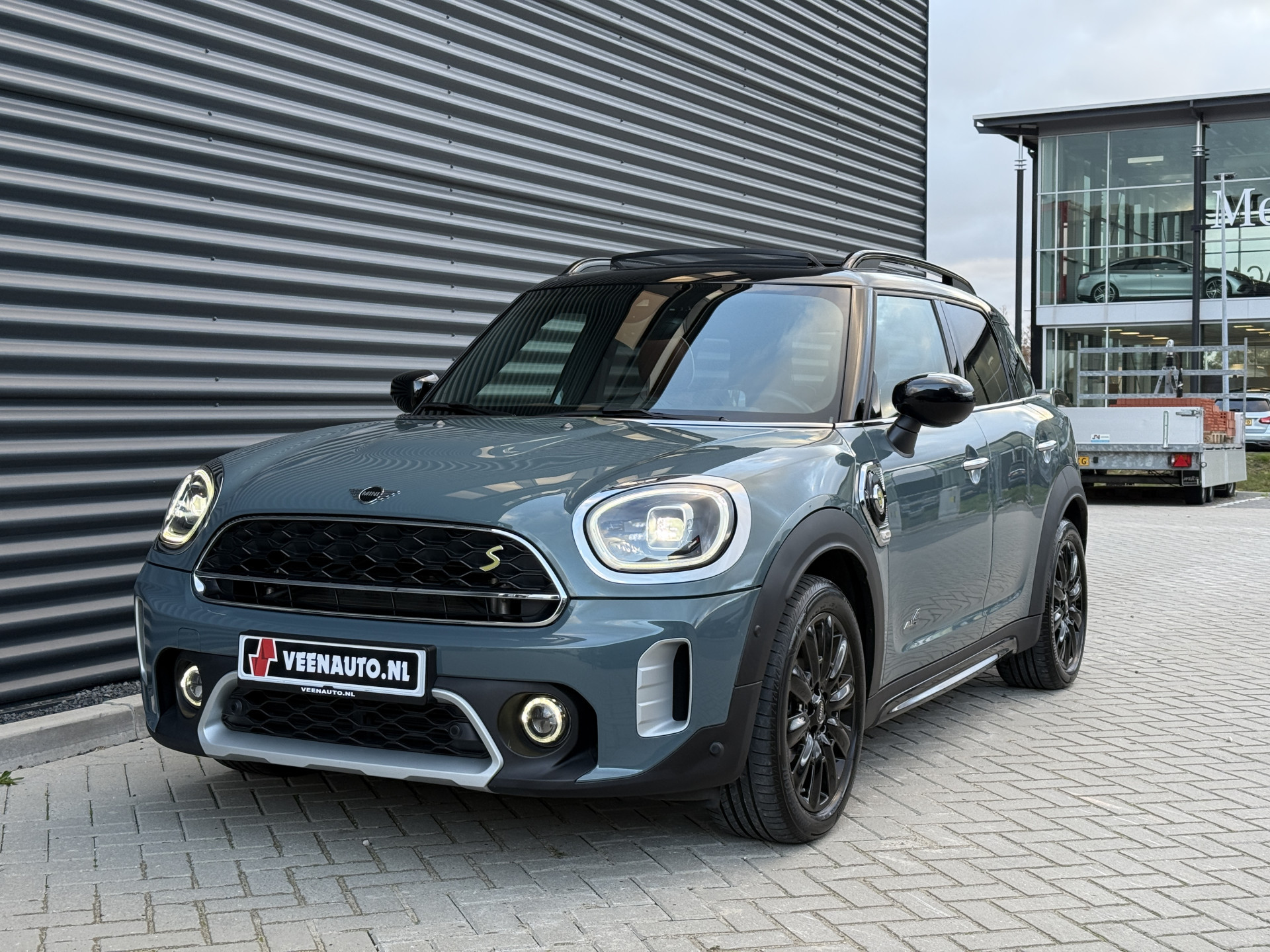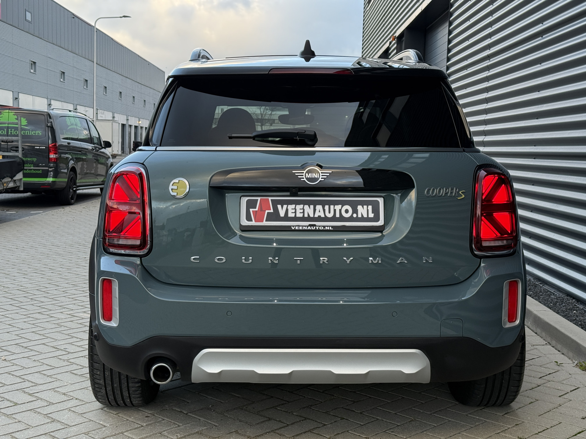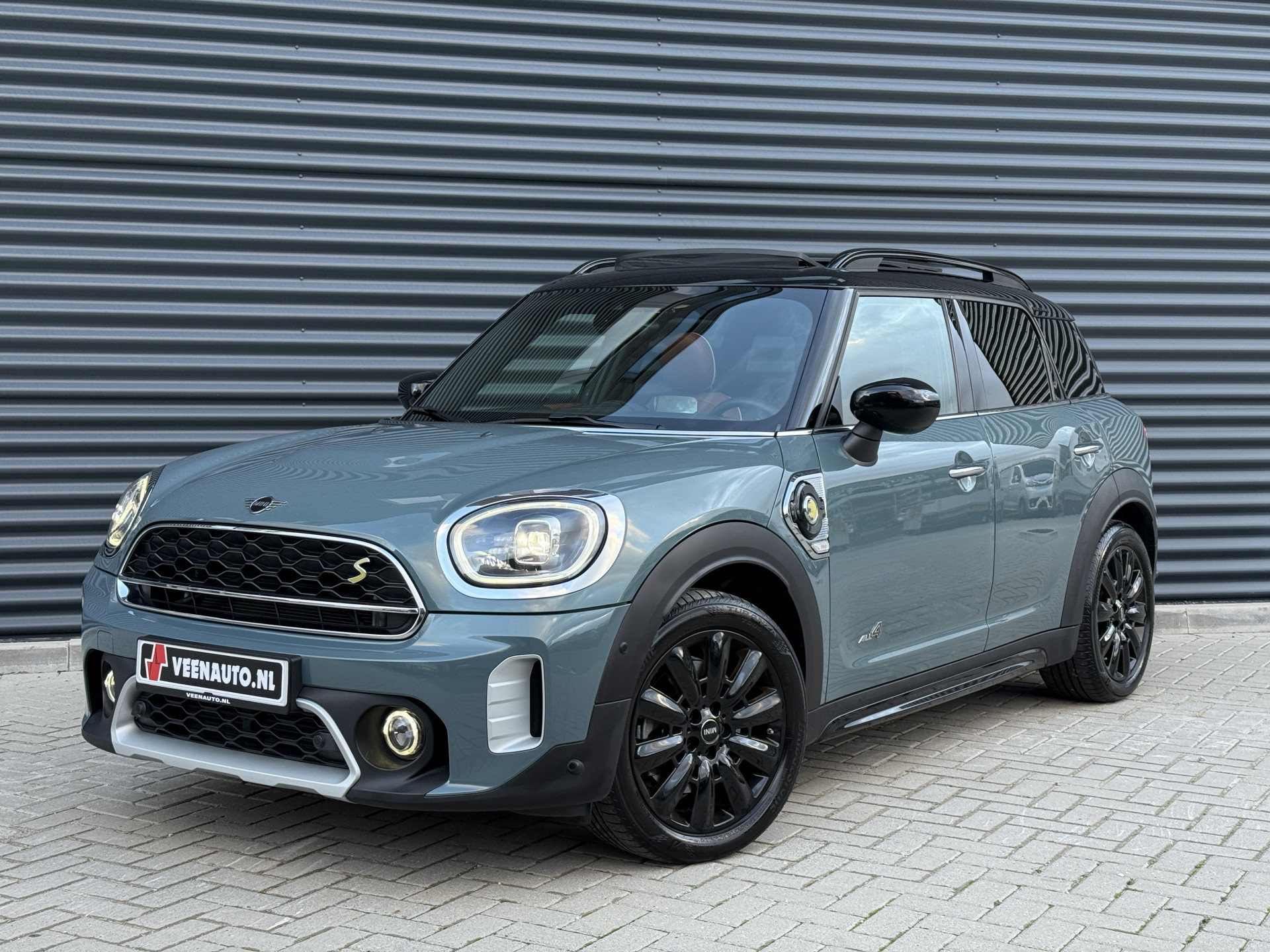 Schitterende Mini Countryman 2.0 Cooper SE ALL4 Plug in Hybrid in Sage Green metallic met 18 inch hoogglans zwarte licht metalen velgen. Deze Mini is bijzonder compleet uitgerust met onder andere de volgende opties: Panorama dak, elektrische bedienbare voorstoelen met memory, Chester Malt lederen bekleding, LED verlichtingspakket, Apple Carplay, achteruitrijcamera, navigatie, virtuele cockpit, Head Up display, cruise control, keyless entry, parkeersensoren voor + achter met parkeer assistent, etc..