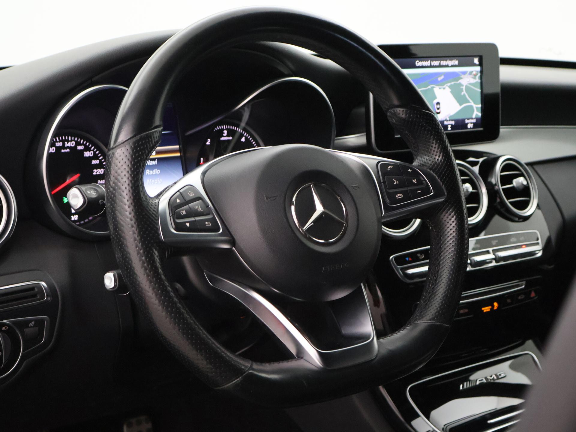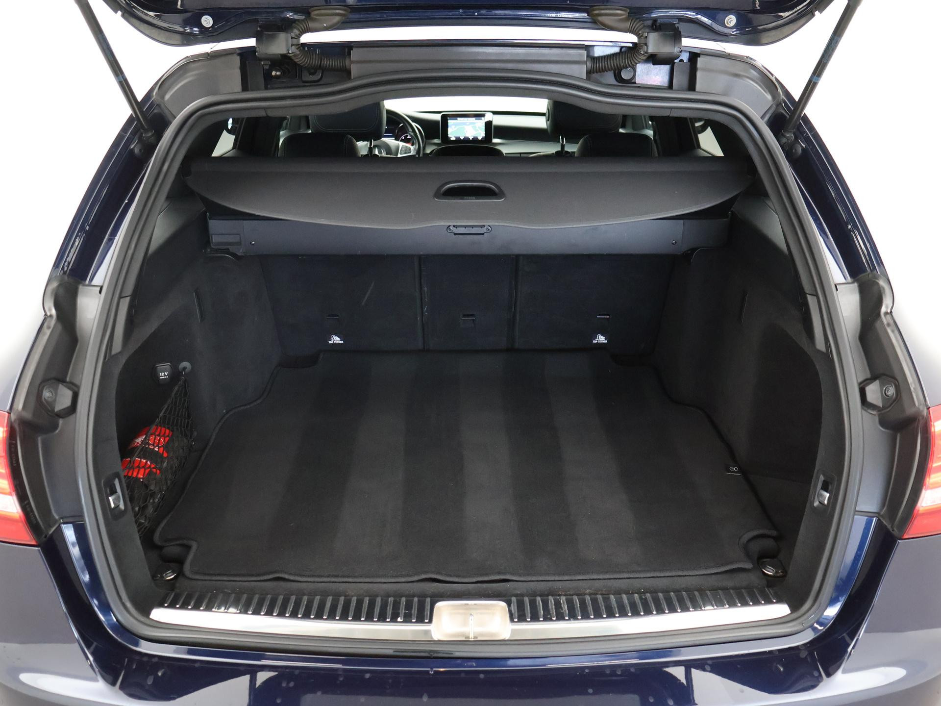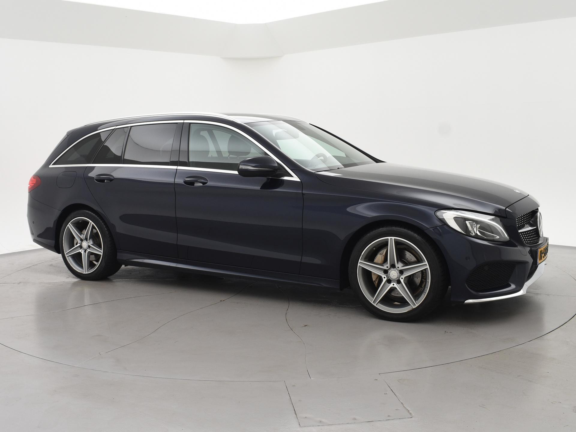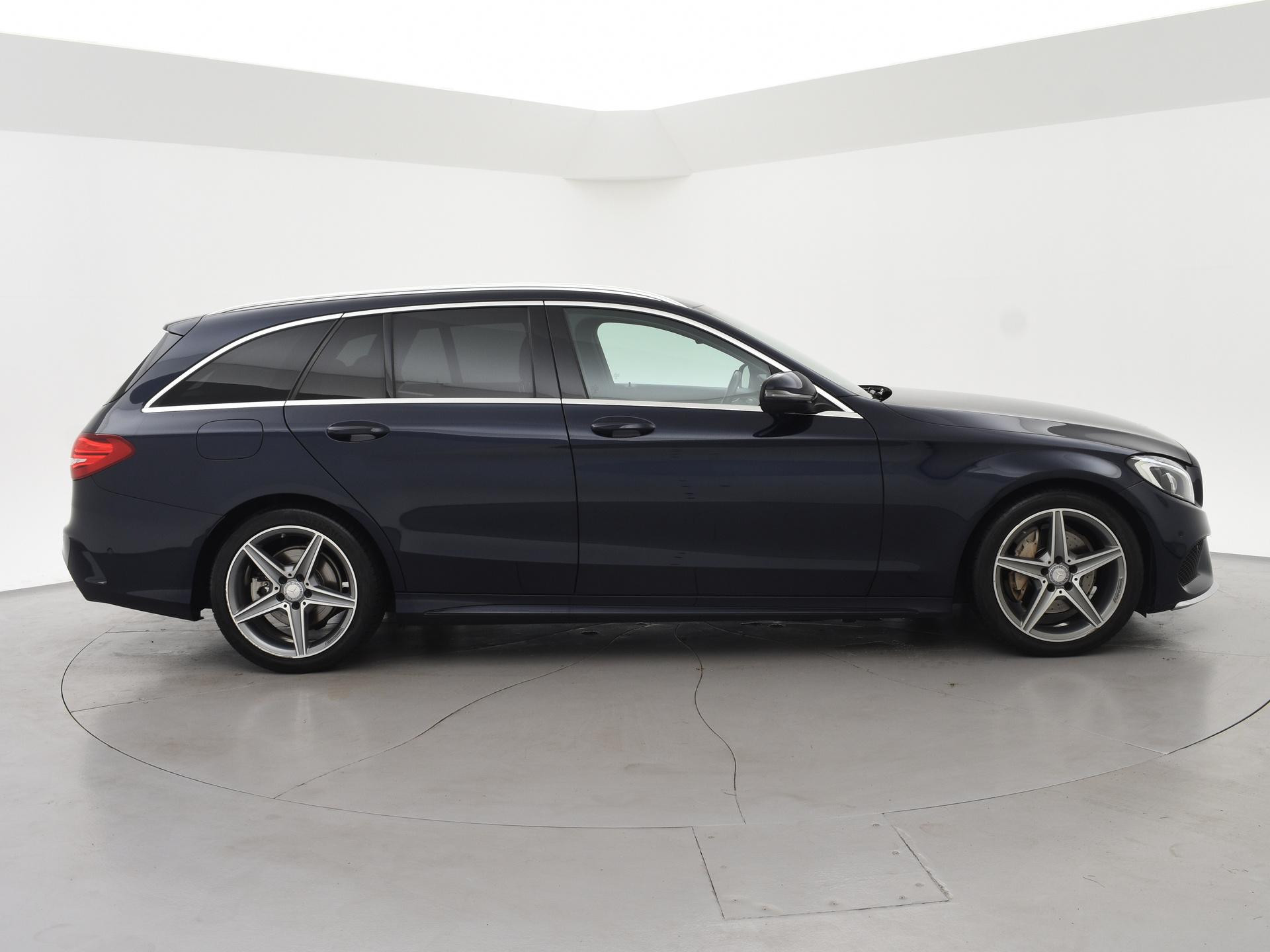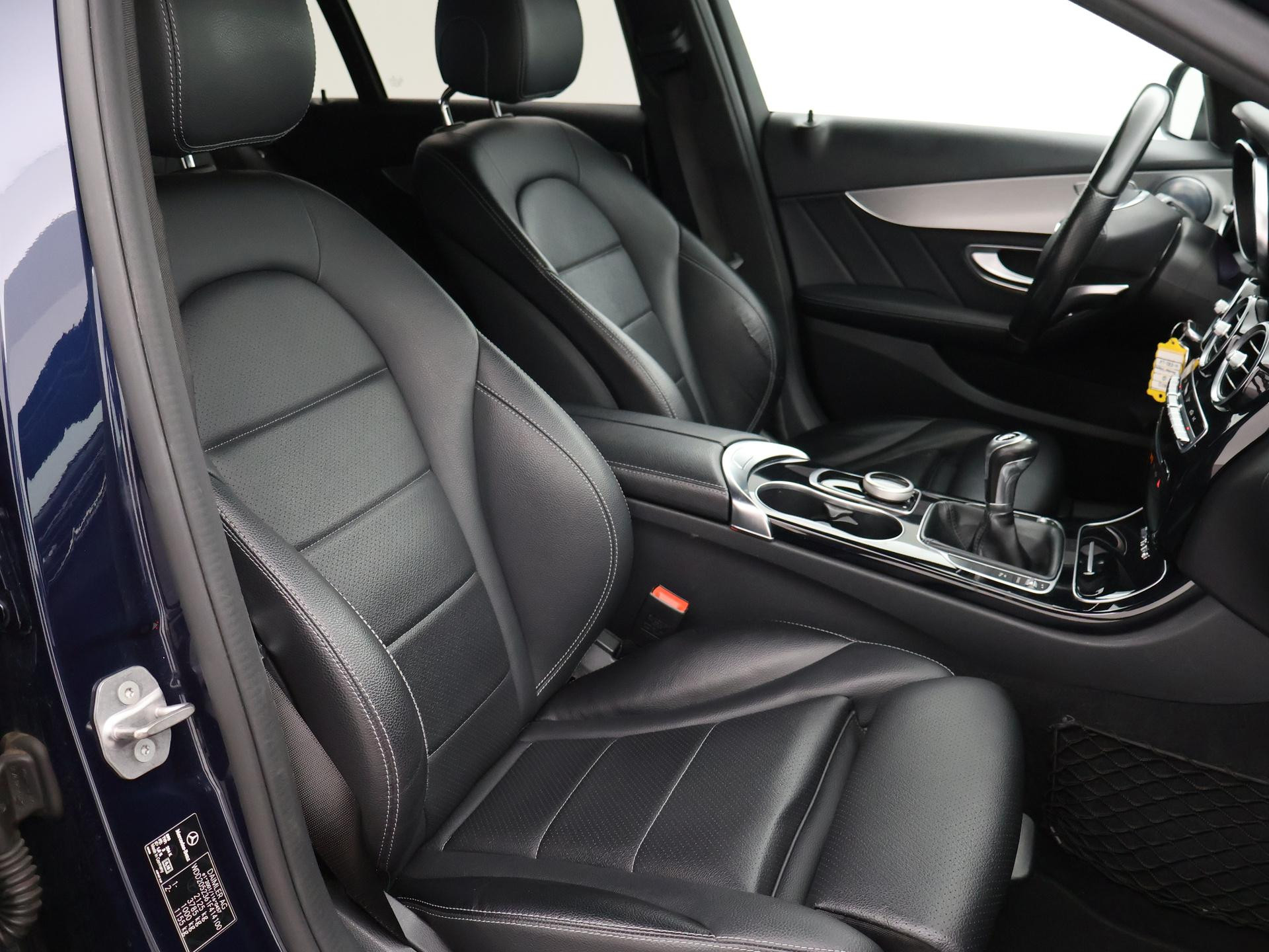Mercedes-Benz C-klasse Estate 180 diesel handgeschakeld met 6 versnellingen, AMG Sport uitvoering, Cavansite Blue metallic exterieurkleur, Volledig (kunst)leder sportinterieur, Sportstoelen met verlengbaar zitvlak, LED koplampen, LED achterlichten, Stoelverwarming met 3 standen, Bluetooth telefoonverbinding met audiostreaming, Navigatiesysteem met kaartweergave, Lichtmetalen velgen AMG, Elektrische achterklep, Diamond grill, Cruise control, Climate control. De bestuurdersstoel heeft scheurtjes. Er zitten Burmester speakerkappen in de deurpanelen, maar wij hebben de indruk dat er niet echt Burmester in zit.