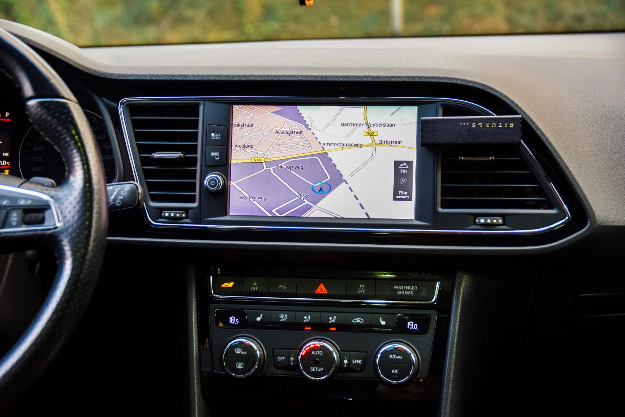 Omdat u nou eenmaal geen ogen in uw achterhoofd heeft, is het altijd lastig om achteruit te rijden zonder brokken te maken. De achteruitrijcamera lost dat probleem op. Kies de muziek waarvan u houdt, dankzij de DAB-radio klinkt het altijd geweldig. Intussen bedient u het audiosysteem en het navigatiesysteem met harde schijf met de knoppen op het stuur. Of het buiten nu warm is of koud, dankzij automatische airconditioning is het binnen altijd behaaglijk. In deze SEAT kunt u zich concentreren op het verkeer, terwijl de auto de omgeving voor u in de gaten houdt. Een automatisch inschakelbare verlichting zorgt dat de verlichting aangaat als het donkerder wordt - in tunnels bijvoorbeeld - en de regensensor schakelt de ruitenwissers in als het nodig is. U hoeft er niets aan te doen. De cruise control zorgt voor een mooie, gelijkmatige snelheid die u zelf instelt. Dat is relaxt! Met sportstuur met schakelpaddels, keyless entry, automatisch dimmende binnenspiegel, centrale deurvergrendeling met afstandsbediening, boordcomputer en lederen versnellingspook is deze auto helemaal compleet.
