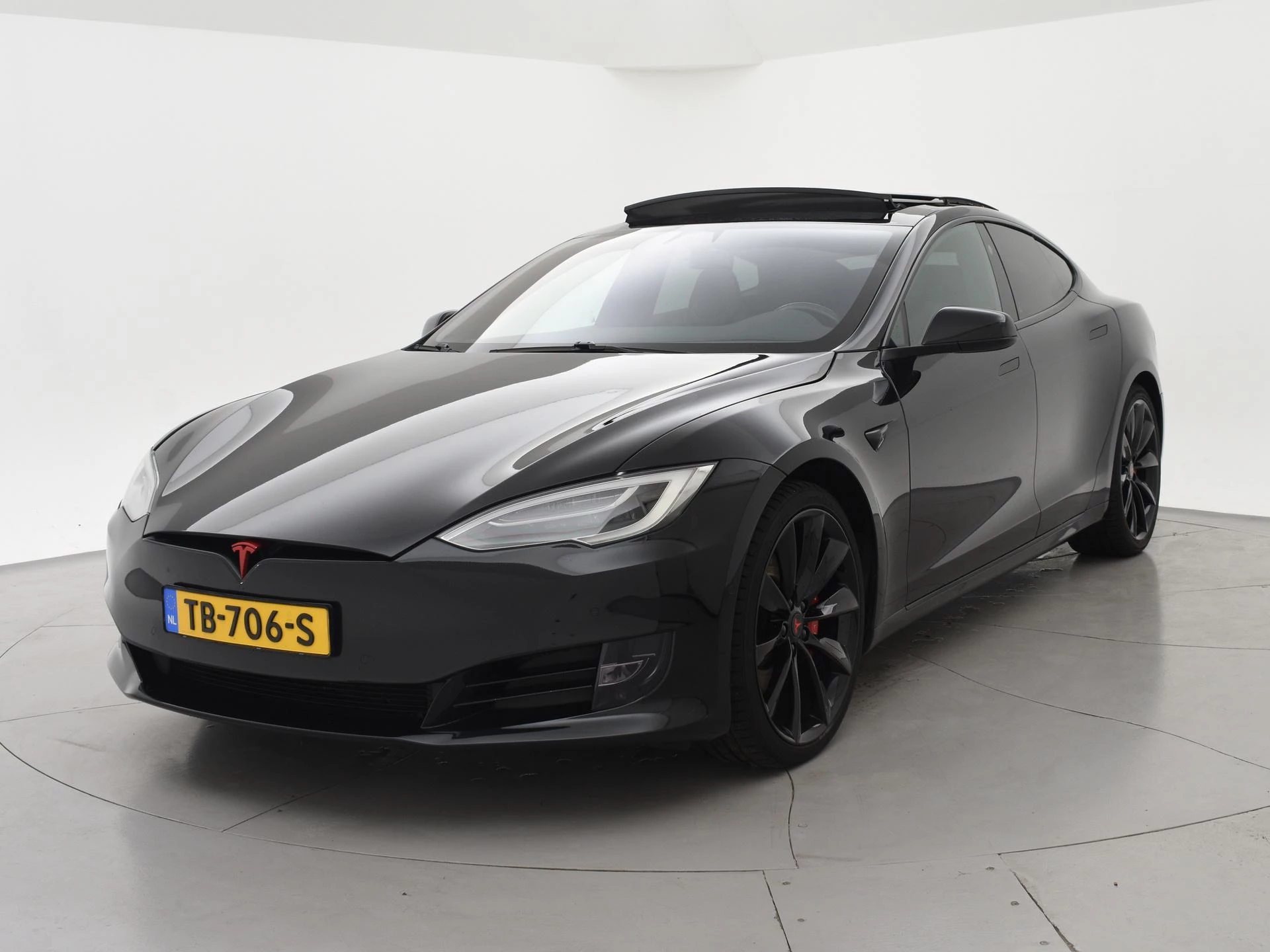 Model S 100D met de 100 kWh accu in de Performance uitvoering met 612 PK in plaats van de standaard 418 PK die de gewone 100D heeft. 613 km actieradius volgens fabrieksopgave, RDW nieuwprijs 162.450 euro, Zwart met zwart leder interieur en zwarte alcantara hemelbekleding, Rode Tesla logo's, Verbeterde Autopilot Enhanced Autopilot 2.5, Stuurwielverwarming, Stoelverwarming voor + achterin, 21 inch hoogglans zwarte velgen, Panorama schuif/kanteldak elektrisch bedienbaar, Carbon interieur pakket met carbon dashboard inleg, Achteruitrijcamera, Spotify, Spelletjes en apps, Digitale radio, LED koplampen, LED achterlichten, Adaptive cruise control, Luchtvering met regelbare rijhoogte,