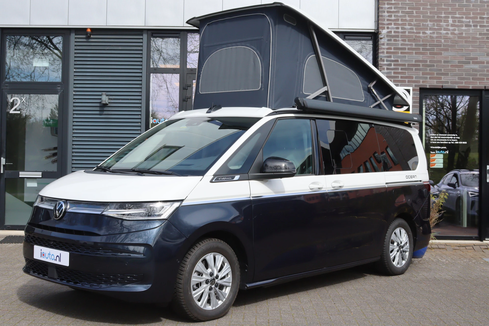 Volkswagen Multivan California T7 met de krachtige en zuinige 1.5 eHybrid 180kW/245pk Plug-in hybride motor in combinatie met de 4Motion aandrijving. In de prachtige two tone kleurencombinatie Starlight Blue metallic / Candy white in de meest luxe Ocean uitvoering met zeer veel opties, onder andere: Matrix-LED-koplamp (IQ.Light), Dynamische grootlichtregeling, Achterlichten donker getint, Navigatiesysteem Discover Pro (10"), parkeersensoren voor en achter met de originele achteruitrijcamera met 360 view, adaptieve cruise control, adaptief onderstel (DCC), dodehoek sensor, DAB+ radio, stoelverwarming en stuurverwarming, Rijstrookwisselassistent (SideAssist) met Uitparkeerassistent en Uitstapwaarschuwing, Keyless entry/start, App-Connect (Apple CarPlay/Android), Stuurbekrachtiging snelheidsafhankelijk, originele wegklapbare trekhaak, versterkte kunststof vloerbedekking in houtlook, Elektro-hydrolisch hefdak inclusief 3 ramen, vooropening en tentdoek in Basalt Grey, origineel Alarm klasse 3, Head-up display, sfeerverlichting, luifelrail aan beide zijden, deels lederen/alcantara bekleding Art-Velours en 19" inch lichtmetalen velgen met zomerbanden en 17" lichtmetalen velgen met winterbanden (gemonteerd op de foto's). Deze California wordt geleverd inclusief de originele fabrieksgarantie.