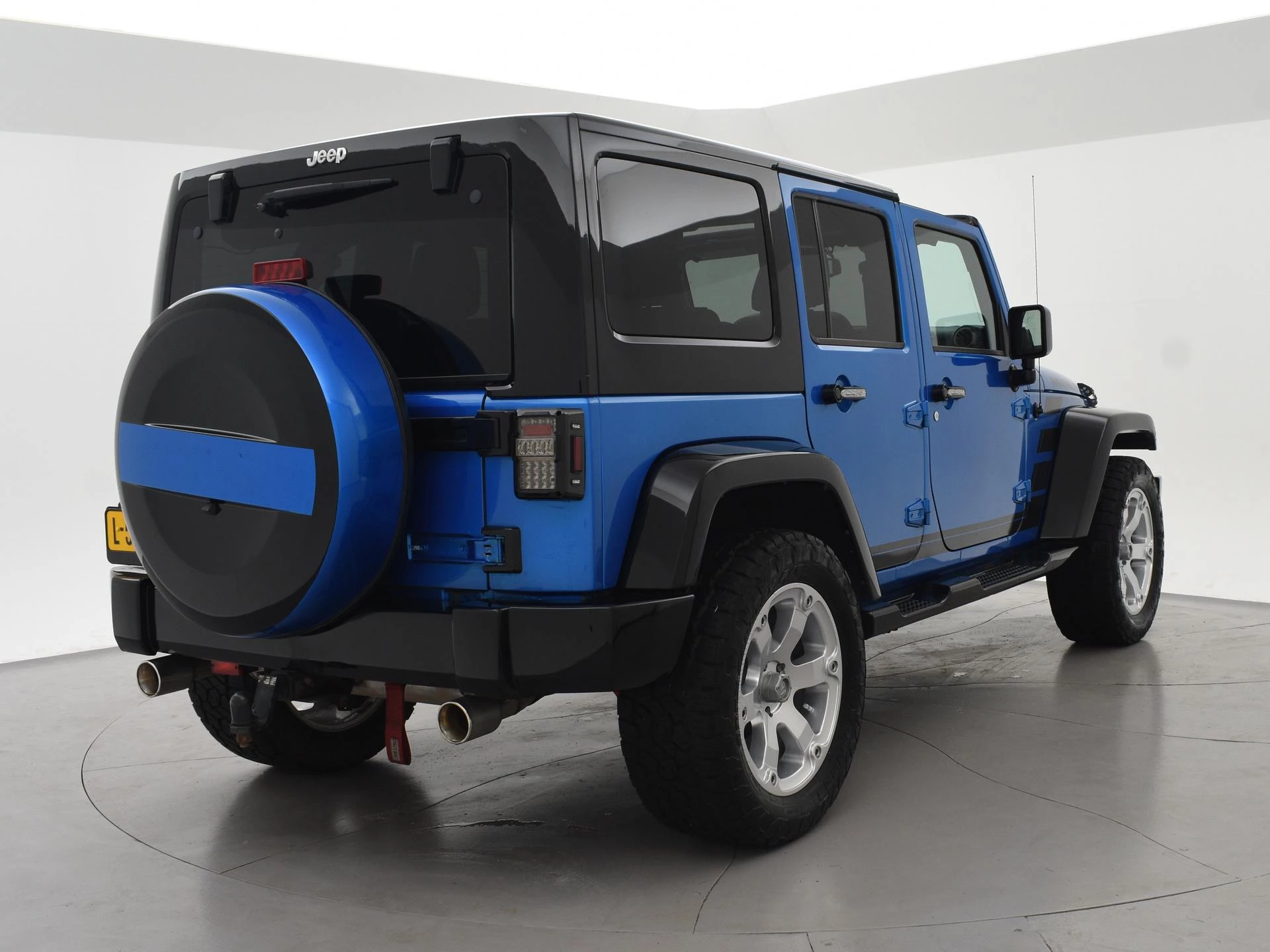 Wrangler Unlimited 5-deurs 3.6 Automaat 4X4 284 PK in de kleur Hydro Blue Pearl Coat met zwarte bumpers, zwarte spatbordverbreders, sidebars en dak, Hardtop en softtop allebei aanwezig, allebei zwart van kleur. Zwart volledig leder interieur met blauw stiksel, Apple Carplay / Android Auto appstreaming Google Maps, Apple Kaarten / Navigatie, Spotify, Podcast en radio apps, Whatsapp, Flitsmeister en vele andere apps, Phoenix Gold Premium audio met subwoofer in de achterdeur, 20 inch lichtmetalen velgen met grove All Terrain banden, Achteruitrijcamera, Cruise control, Airco, LED lichtbalk voorop, LED koplampen, LED achterlichten, Hardcover over het reservewiel, Blauwe sfeerverlichting interieur.