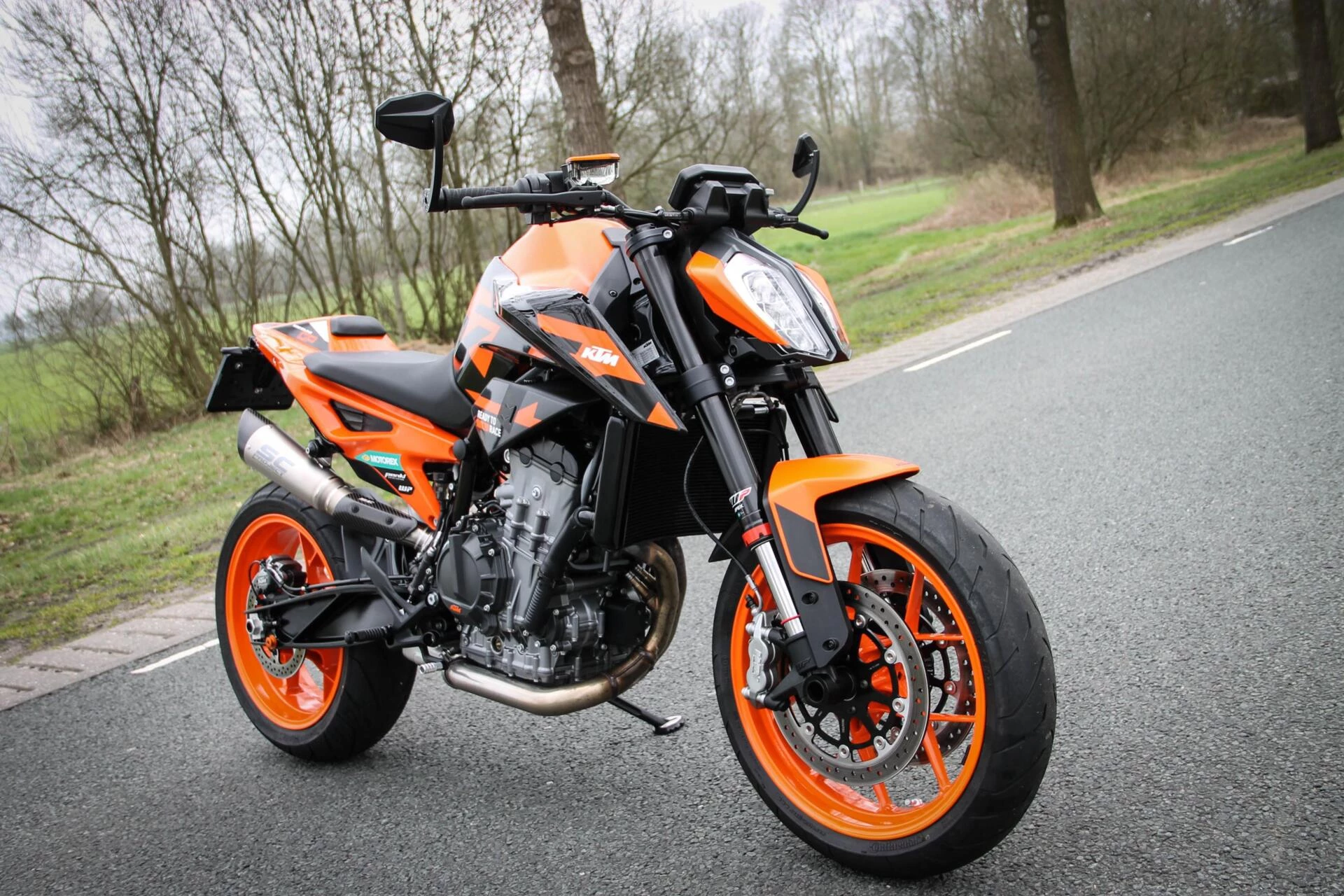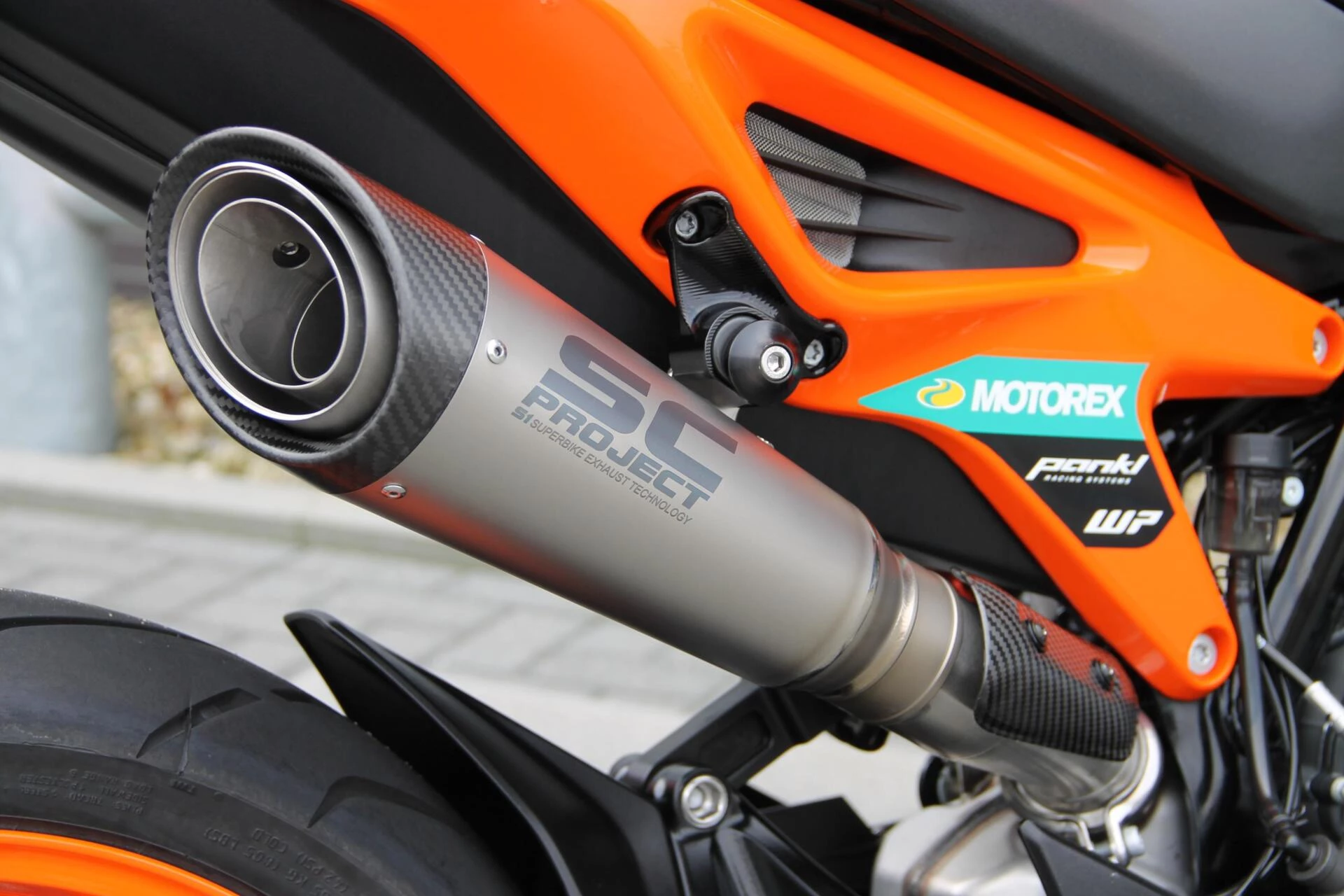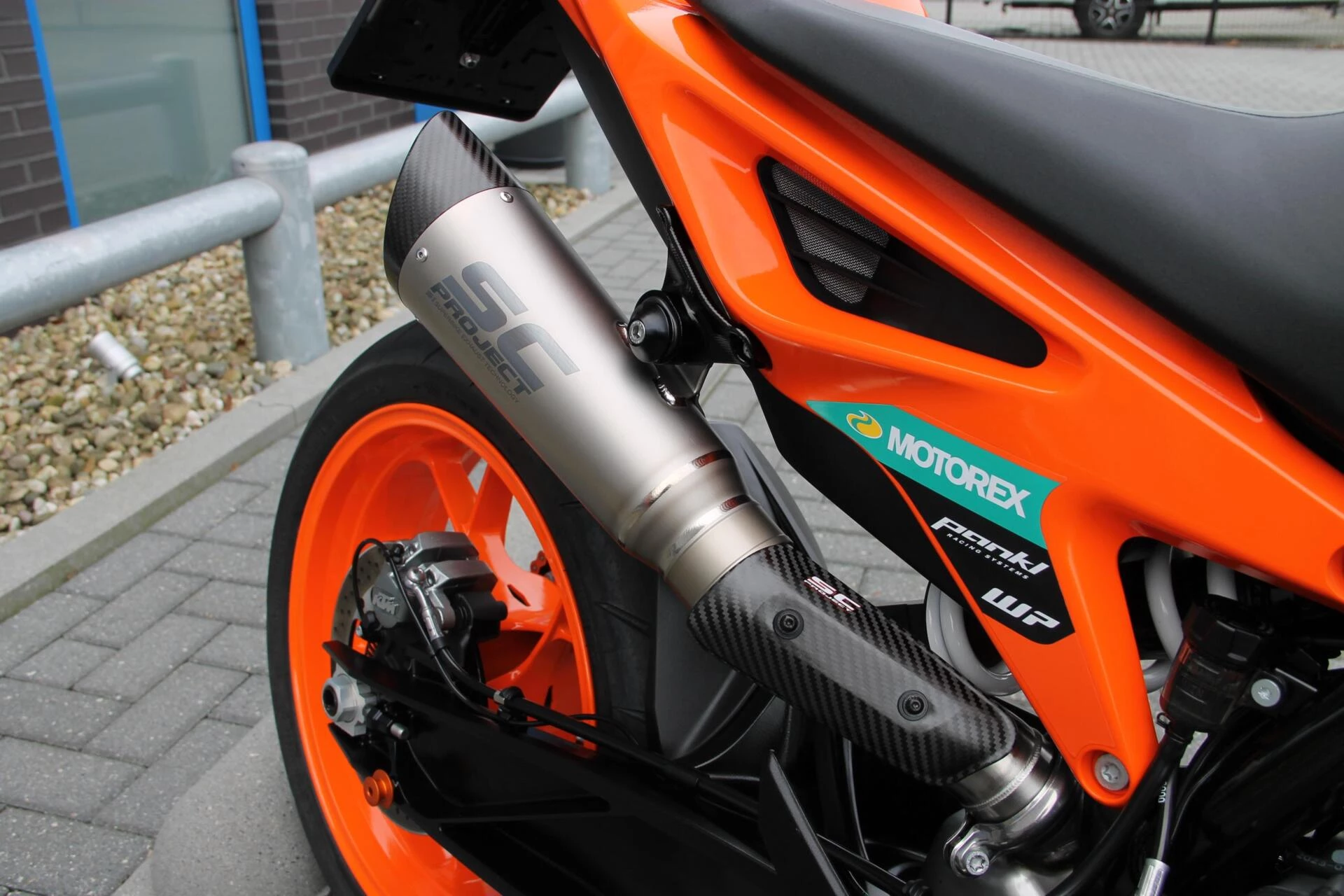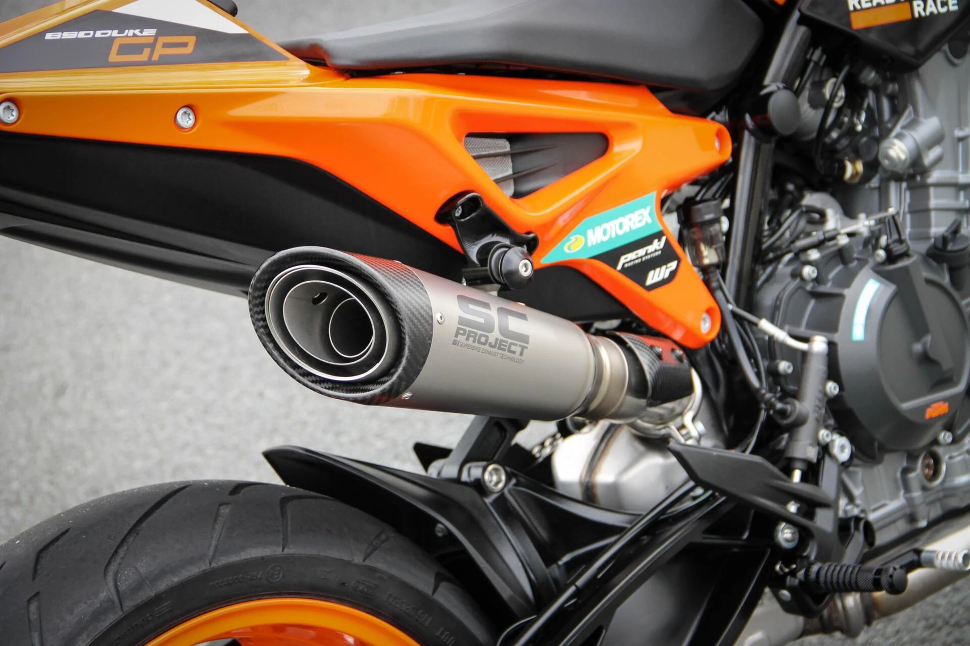 De gemonteerde SC‑Project S1 titanium demper geeft deze Duke een indrukwekkend diepe, sportieve sound en tilt de beleving naar een hoger niveau. Licht, hoogwaardig en volledig passend bij het karakter van deze machine.