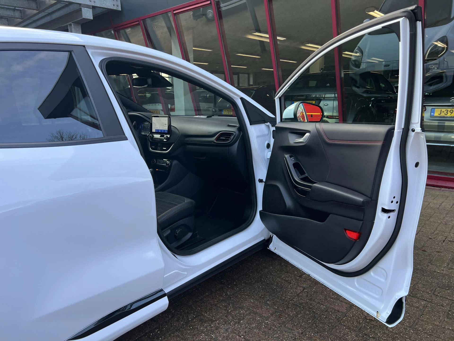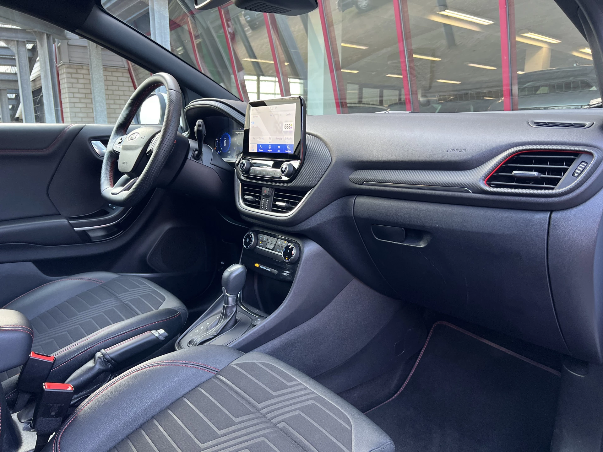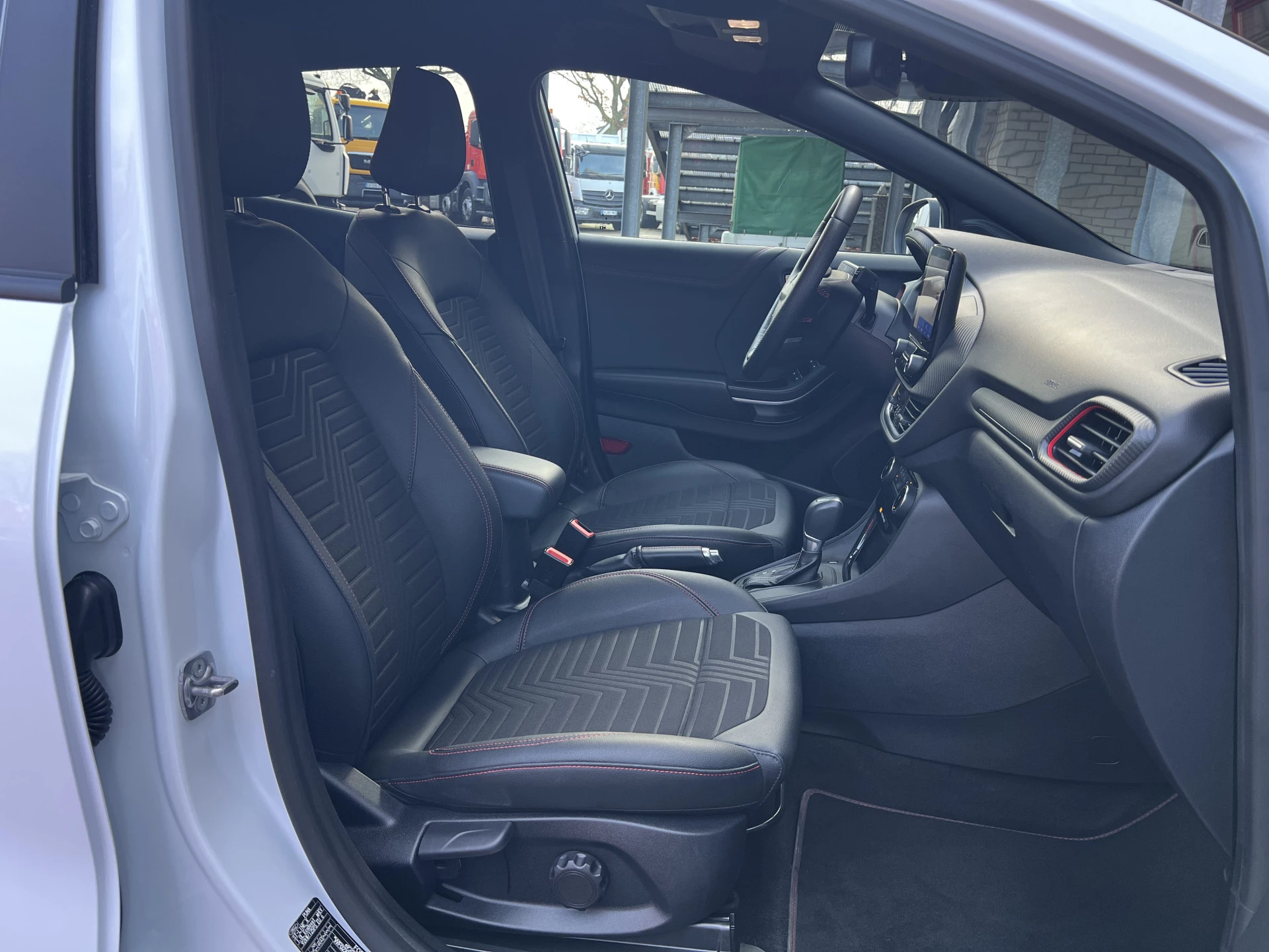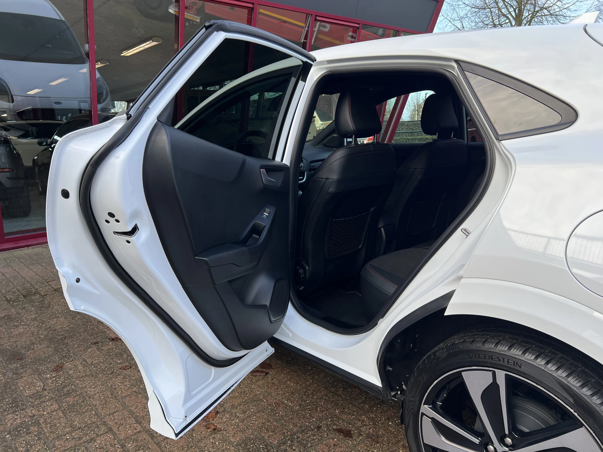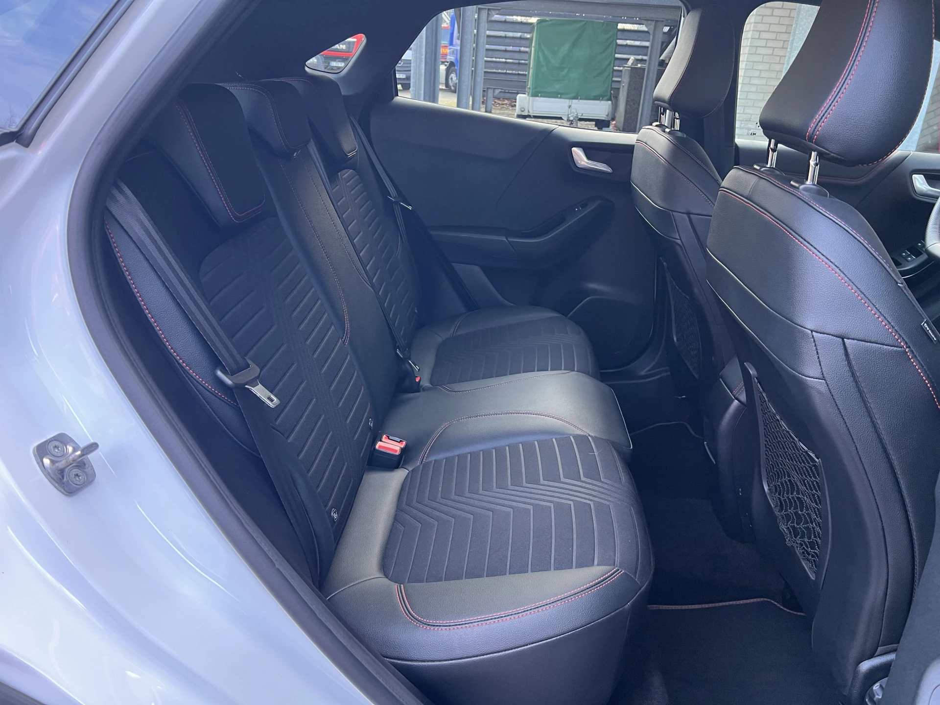 Een als nieuwe Ford Puma in de sportieve en meest luxe ST Line X uitvoering. Uitgevoerd in de mooie kleurcombinatie van Frozen White met zwarte accenten en een lederen/stoffen sportinterieur met aluminium, carbon en rode accenten en een zwarte hemelbekleding.