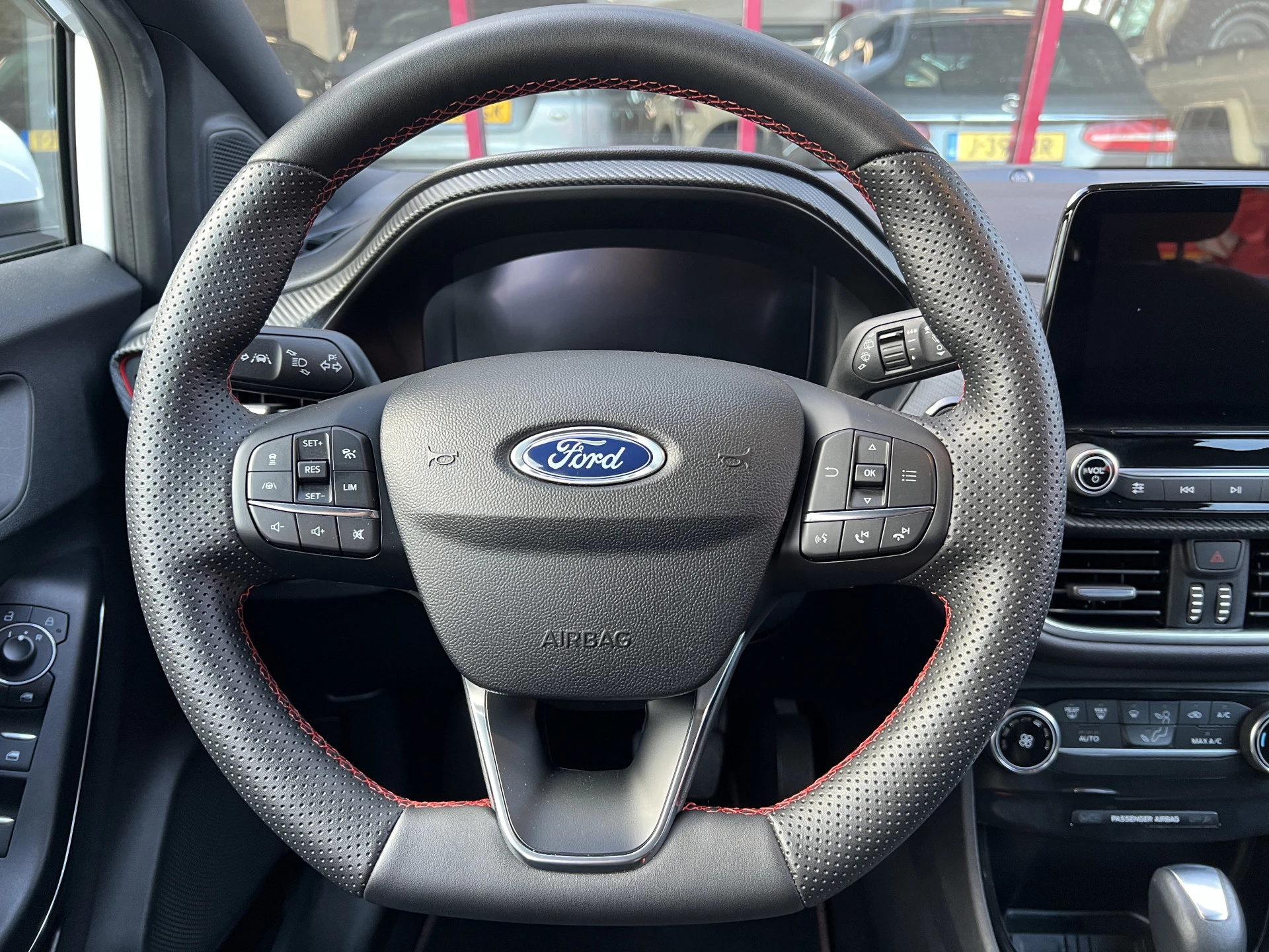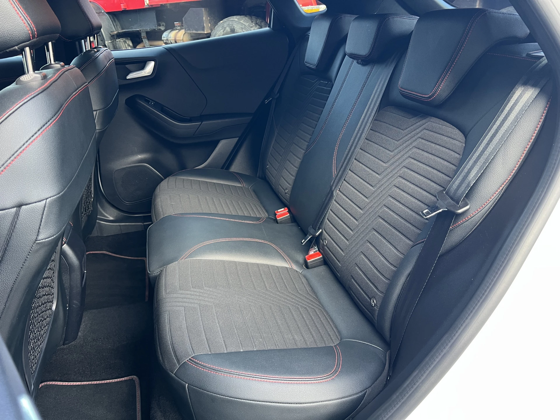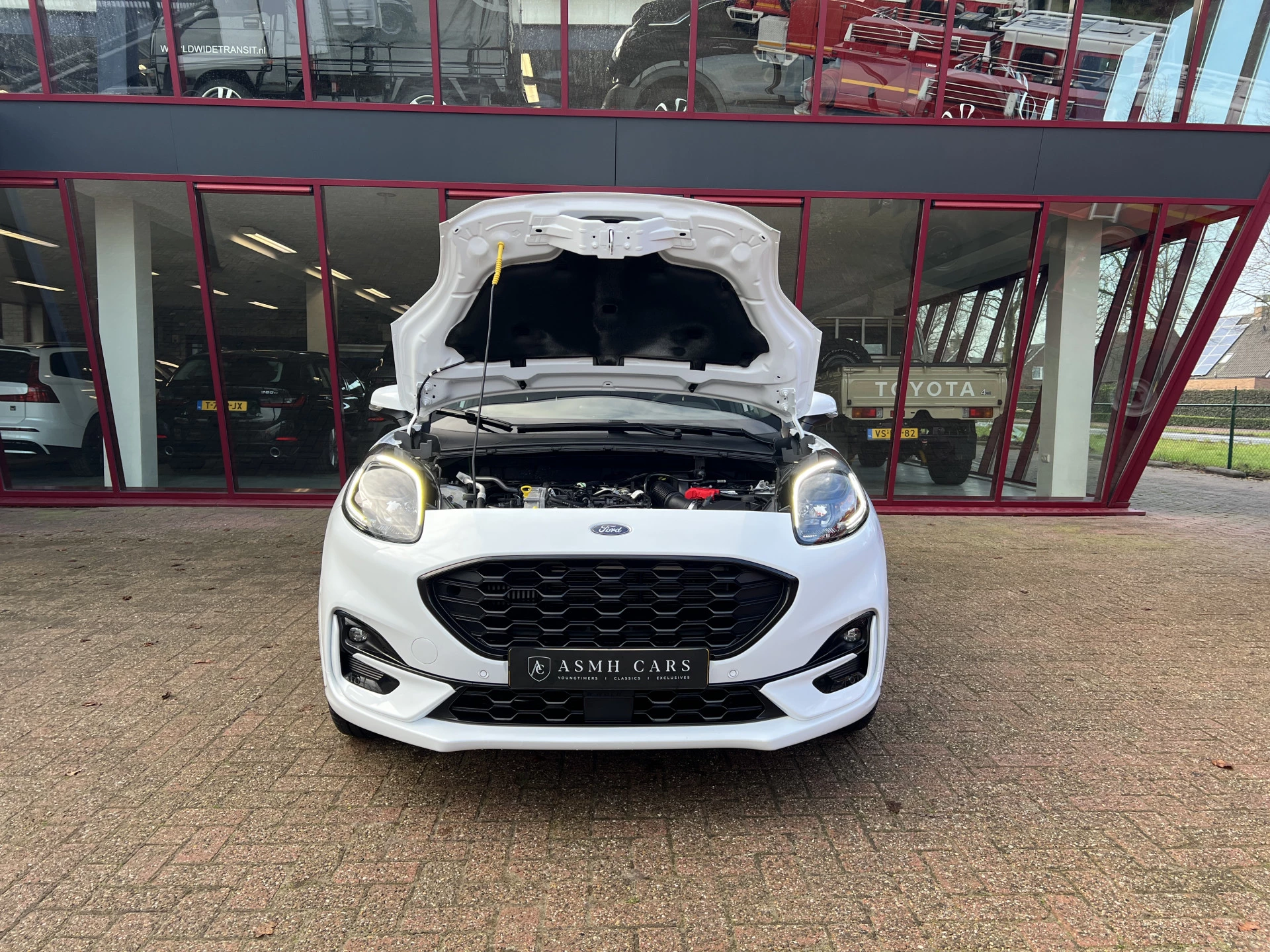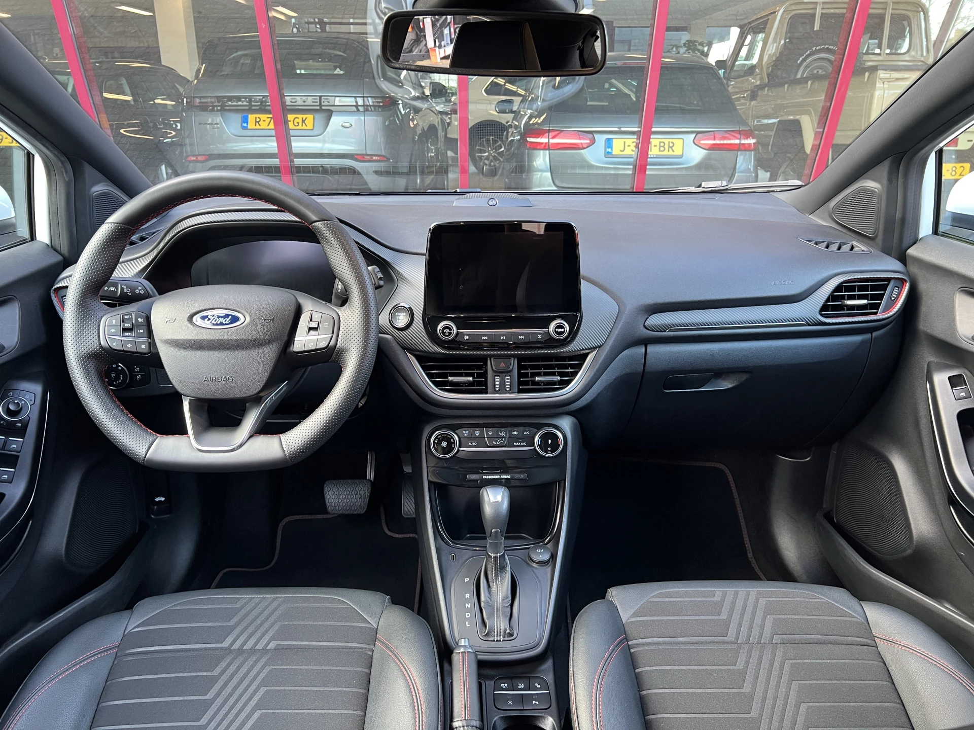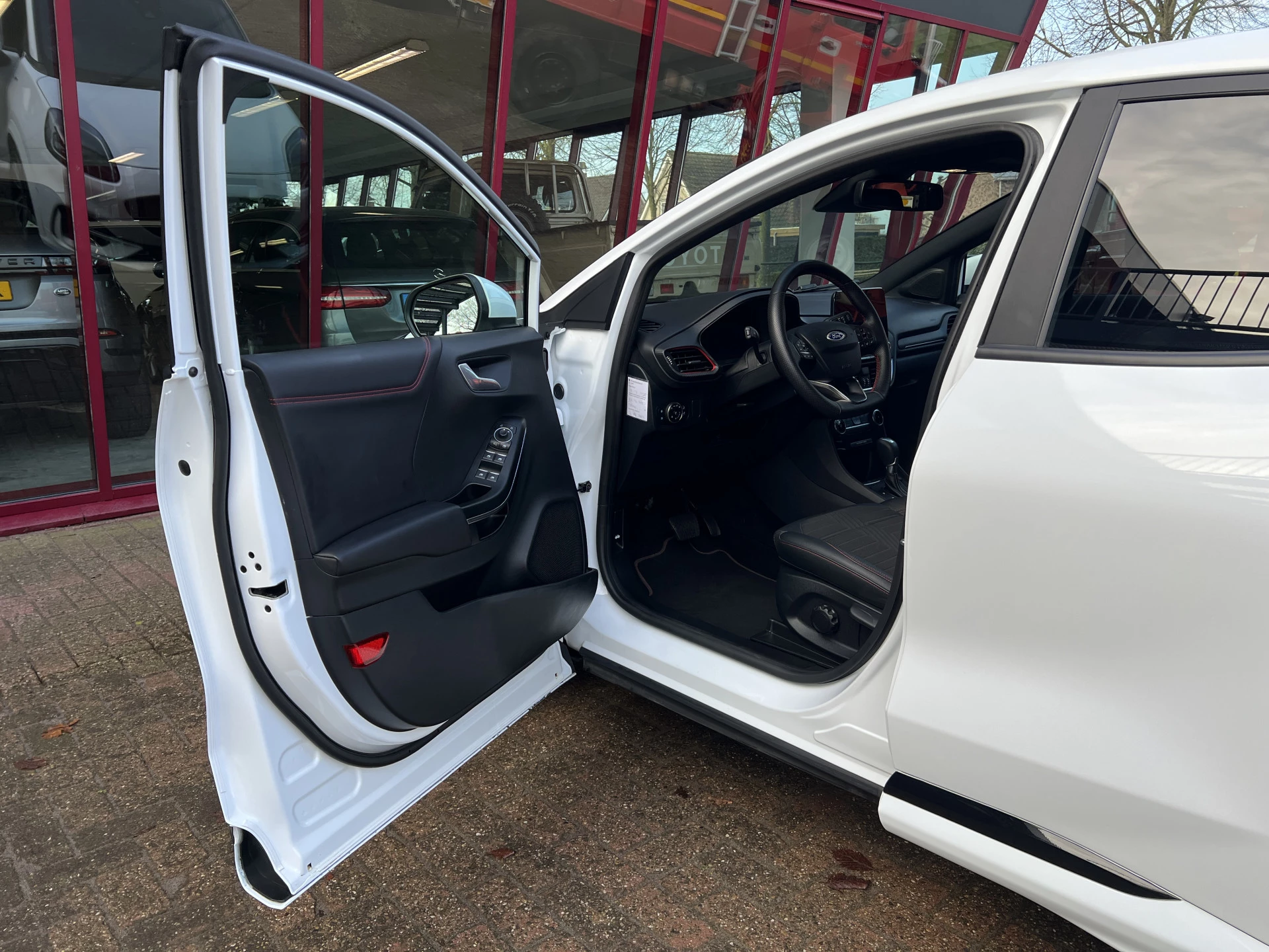 Een als nieuwe Ford Puma in de sportieve en meest luxe ST Line X uitvoering. Uitgevoerd in de mooie kleurcombinatie van Frozen White met zwarte accenten en een lederen/stoffen sportinterieur met aluminium, carbon en rode accenten en een zwarte hemelbekleding.
