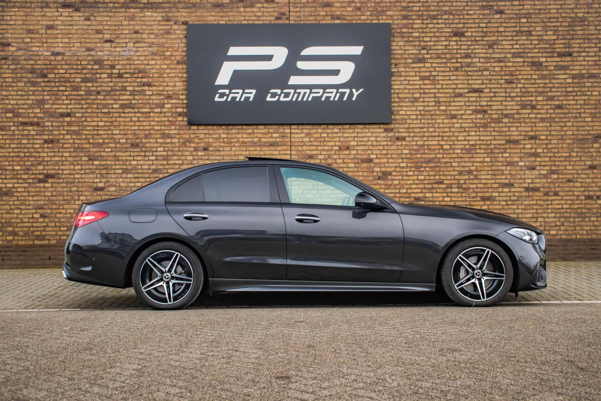 Het model is uitgevoerd in een chique donkergrijze kleur en staat op fraaie 18 inch velgen. Het AMG Line pakket geeft deze C-klasse een scherpere, sportievere uitstraling, terwijl het panoramadak het geheel extra exclusief maakt. De auto oogt modern en krachtig, met subtiele chromen details en een dynamische koets.